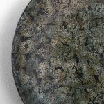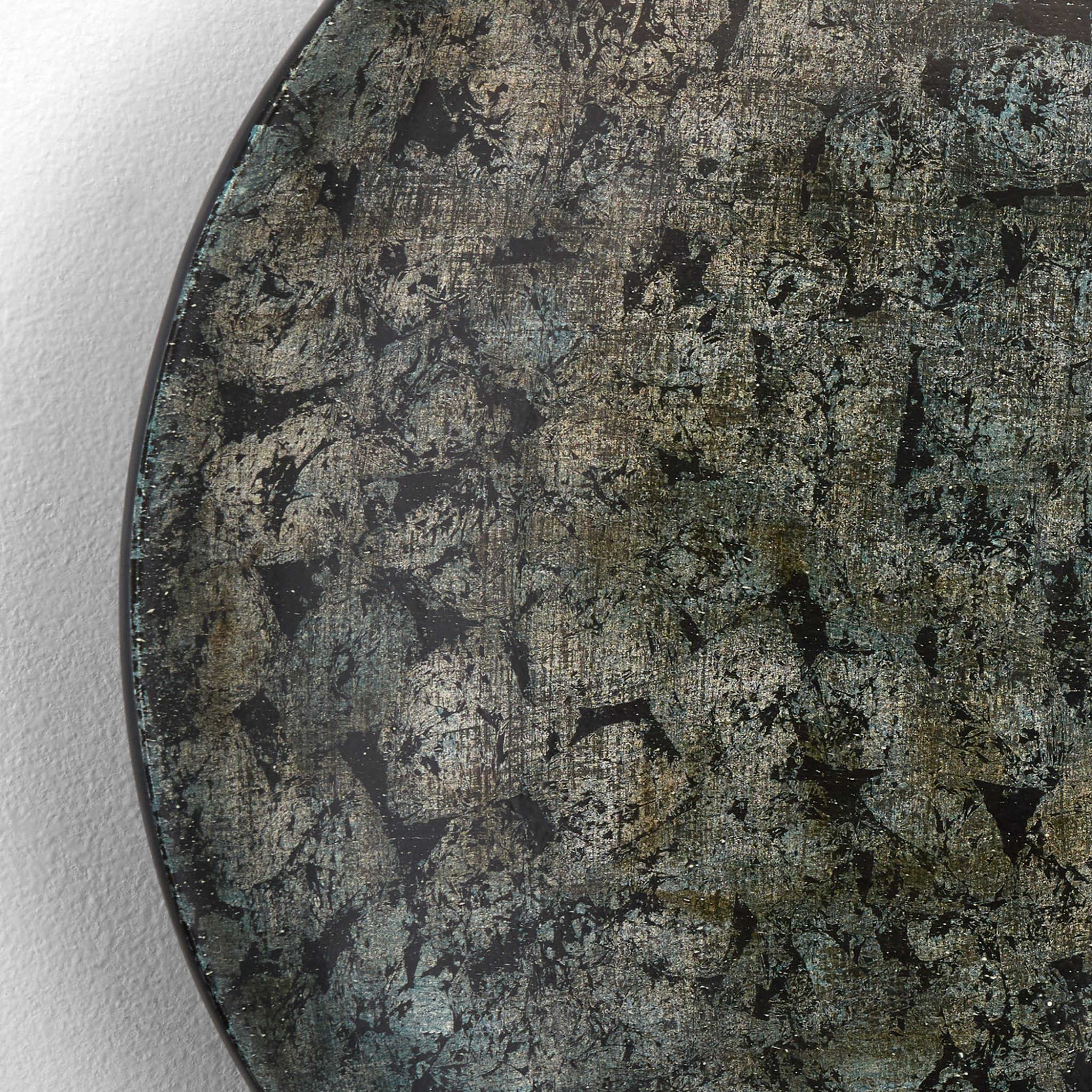 Inspired by abstract artistry, the Lunar Round Wall Art blends layers of black, blue, and silver for a striking visual effect. Hand-painted on spun bamboo disks, this versatile piece can be displayed as wall d?cor using the built-in keyholes or used as a striking tabletop charger (not food-safe). Dust with a dry cloth for easy maintenance.