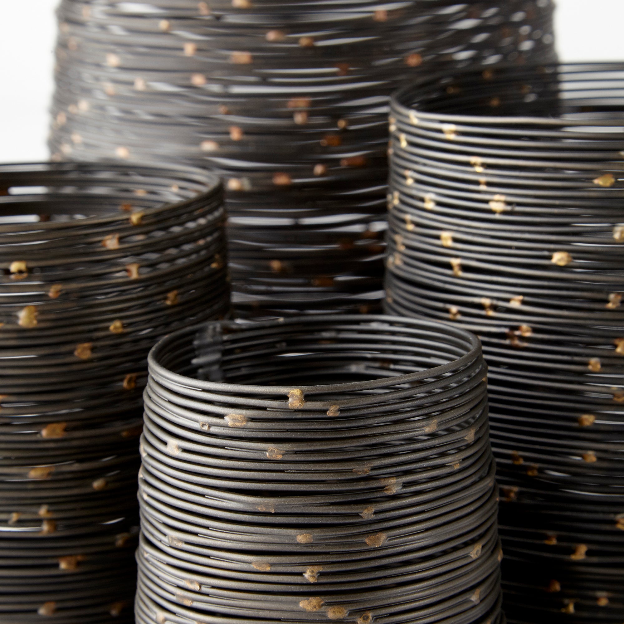 Wire-like bands circle this exceptional metal candle holder to provide a stylish glow from within. In an antique black finish, this extra-large holder is a charming addition to a dining room.