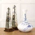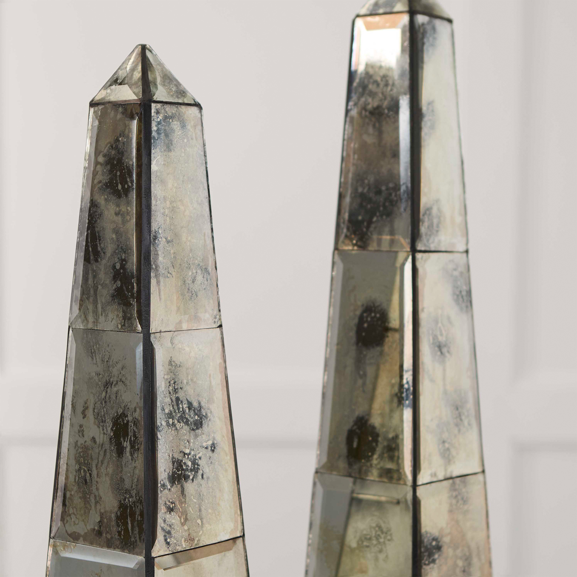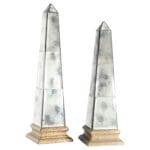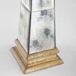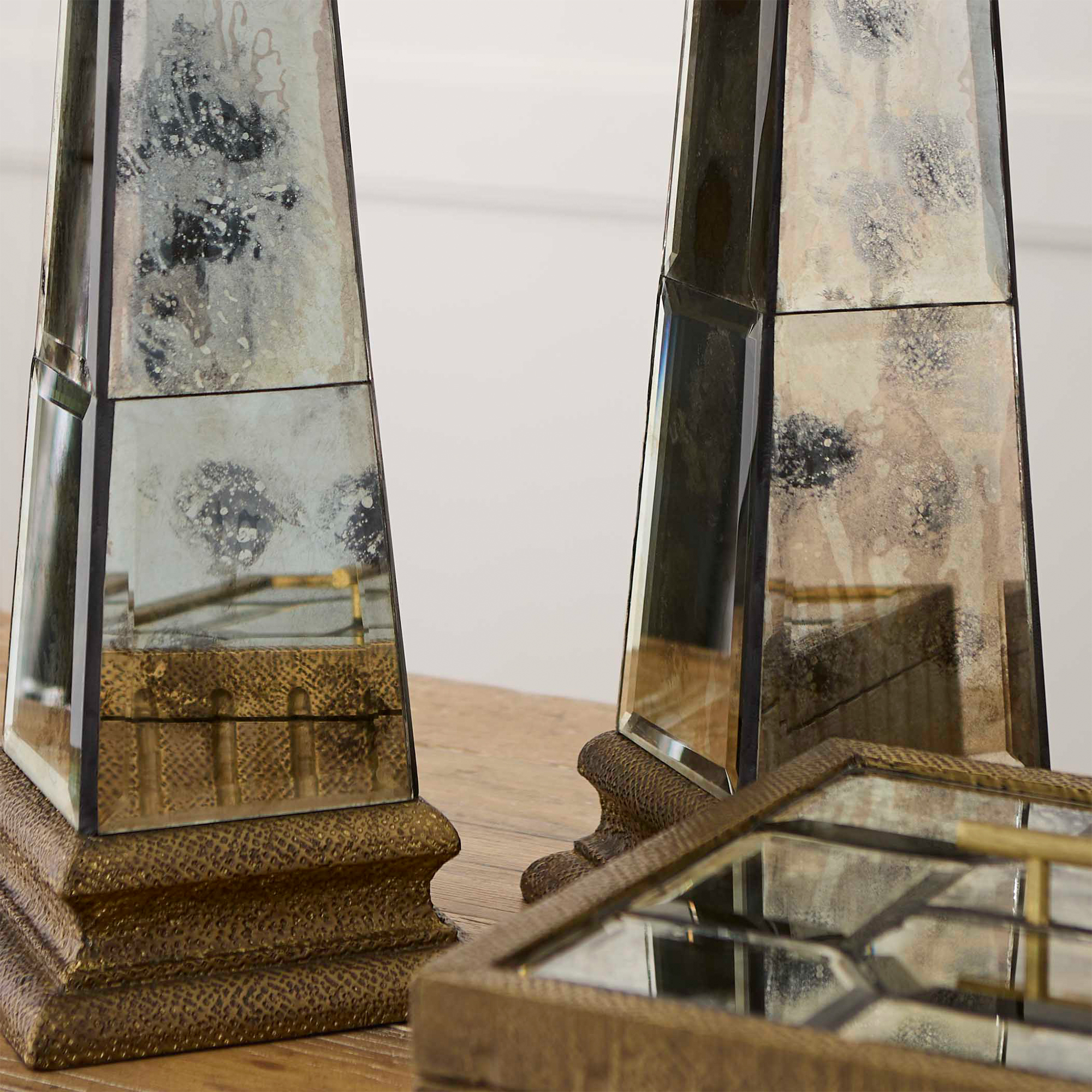 The Luxor Collection is an exquisite fusion of elegance and artistry. The Luxor obelisk is crafted with a mitered corner base and hand-applied brass cladding. Artisans delicately emboss textured sheet brass before hand-pressing it onto the MDF substrate, resulting in a seamless and luxurious finish. Hand-embossed finishing nails add a touch of refinement, while the hand-cut antiqued mirrored glass panels generate captivating light play. Elevate your decor with the Luxor Collection and indulge in the beauty of handcrafted luxury. Available in two sizes.