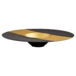 The Magen #2 bowl is a gorgeously concentric tray with an inverted bulb in the center. The base is abstractly rendered with a tri-color design in a dark monochrome and gild. Perfect as a utilitarian or decorative item in any interior space.