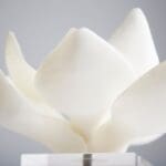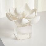 This tabletop accent piece is the perfect complement to any modern ensemble. A design centered around an abstracted, blooming shrub, the Oleander Sculpture is comprised of white resin leaves sprouting from a clear, crystal cubed vase. Perfect for any coastal themed space, or contemporary arrangement.