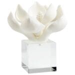 This tabletop accent piece is the perfect complement to any modern ensemble. A design centered around an abstracted, blooming shrub, the Oleander Sculpture is comprised of white resin leaves sprouting from a clear, crystal cubed vase. Perfect for any coastal themed space, or contemporary arrangement.