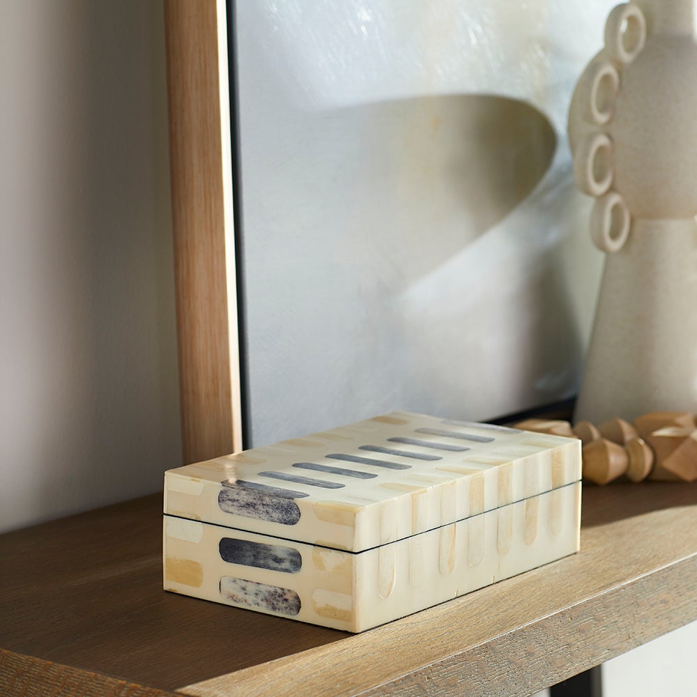 These containers are exceptionally colorful and bring life to any interior space. Its color composition is enhanced by its pastel base. It also features adequate compartmental space for the most precious and sentimental objects. This tabletop accessory is available in a small and large option for added versatility. Display on a bedroom dresser, powder room counter, or sitting room coffee table to add a natural elegance to your ensemble.