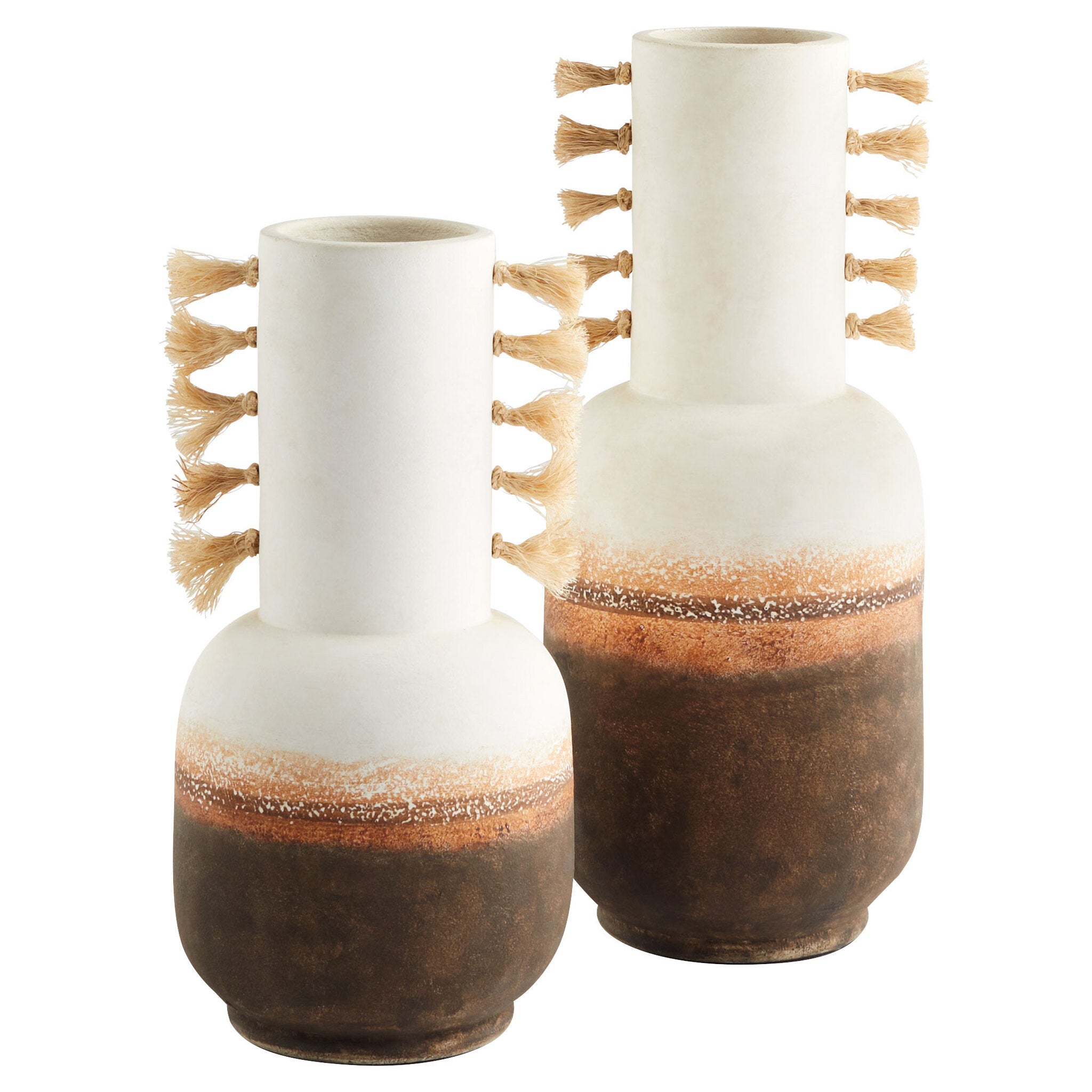 Gaining its namesake from an iconic woman entrepreneur and jute mill owner, the Margaret vase series features two rows of hand-tied jute rope tassels that run up the neck, opposite one another. A classic gourd-shaped body is finished with a brown, rust and white ombre from base to rim. Each of these earthenware pieces is individually produced by hand, contributing to a raw, rustic energy that radiates natural vitality. Utilize the energy by displaying in any living area, dining room or bathroom. Available in two sizes. Not water-tight.