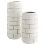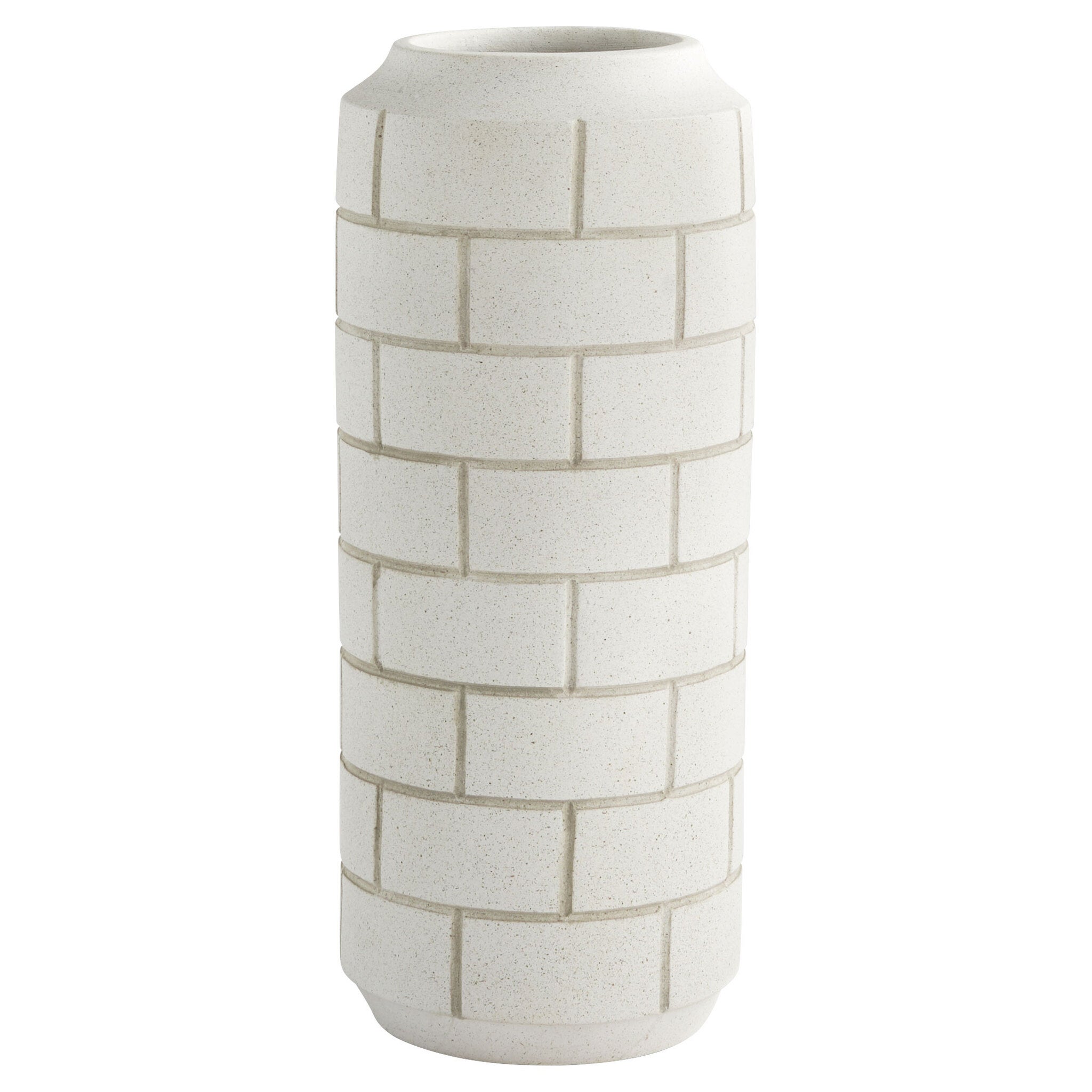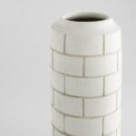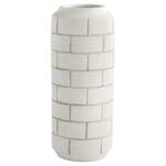 The distinct layed-brick pattern of the Mason vases gives the series of off-white speckled earthenware pieces its inspiration. Smooth cylindrical bodies are slightly tapered at base and rim, adding a touch of variance to balance crisp, perpendicular lines. Add a pop of geometric flair to any office space, washroom or kitchen with the Mase vase collection. Available in two sizes. Not water-tight.