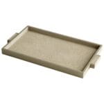 Varying textures from this medium shagreen tray create dimension in any living room. The contrast between the leather and wood add a modern upgrade to a simple silhouette.
