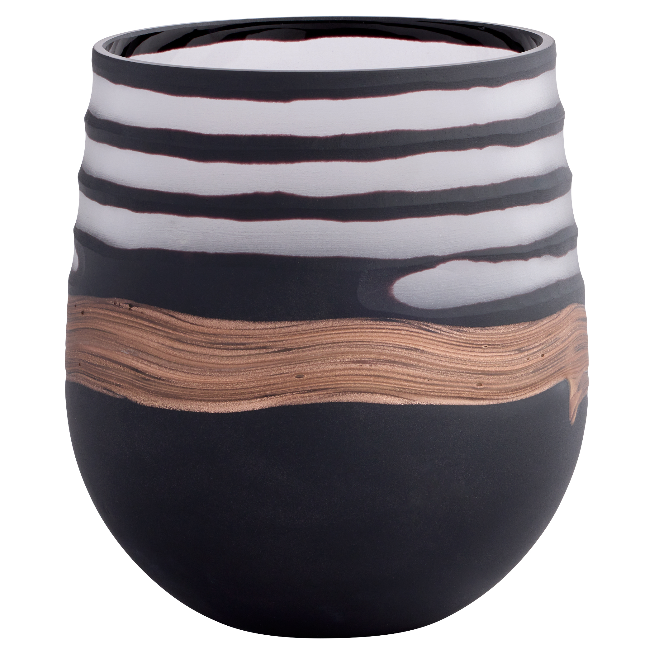 Hand-carved from multi-layered cased glass, the Midnight Road vases display horizontal stripes where the black outer layer has been carefully removed to contrast the clear cased glass. The copper base on these wide-mouthed cylindrical vases remains untouched, creating a natural look and feel. Each vase is unique, with variations in the hand-carved design. Available in three separate sizes.