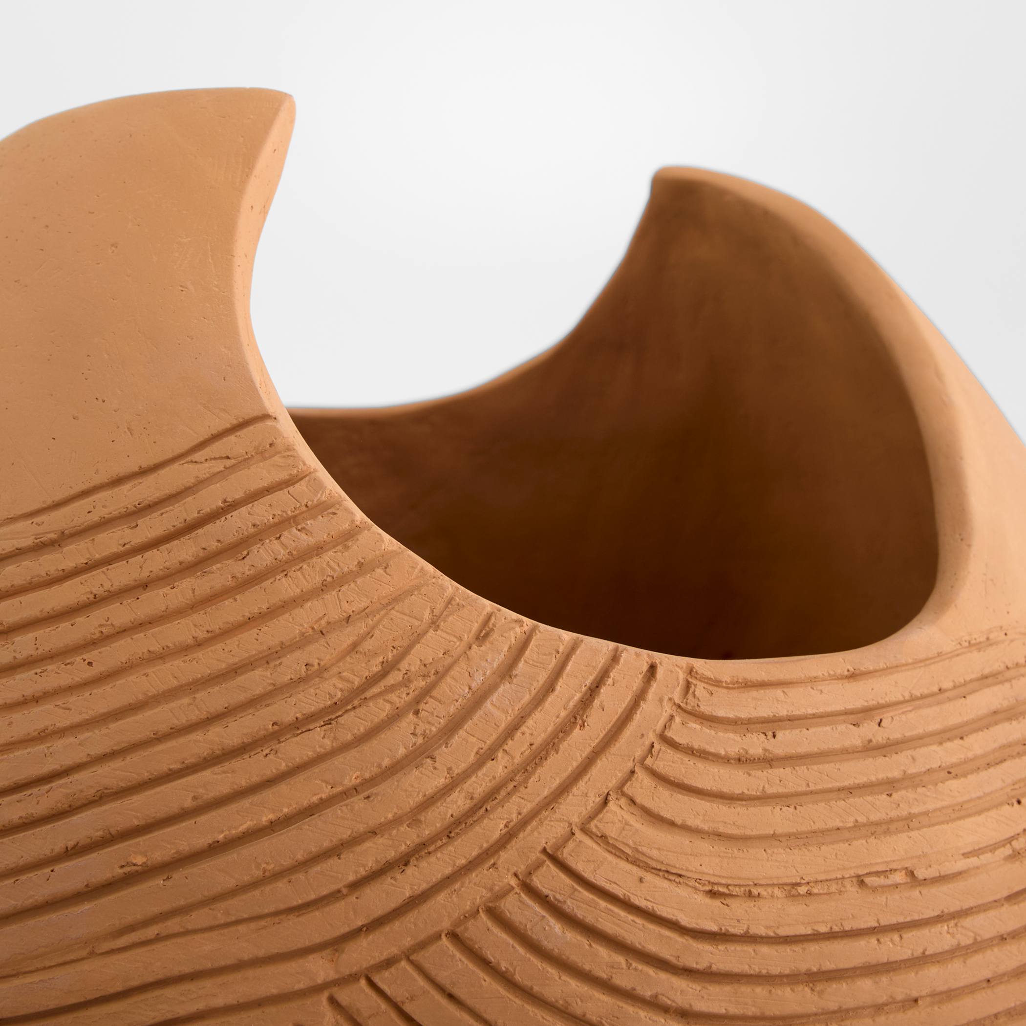 The Miro Vases showcases a hand-formed, bulbous silhouette crafted from unglazed terracotta. Its gently rolling striations follow the natural curves of the form, while the irregularly carved opening adds an organic, sculptural touch.