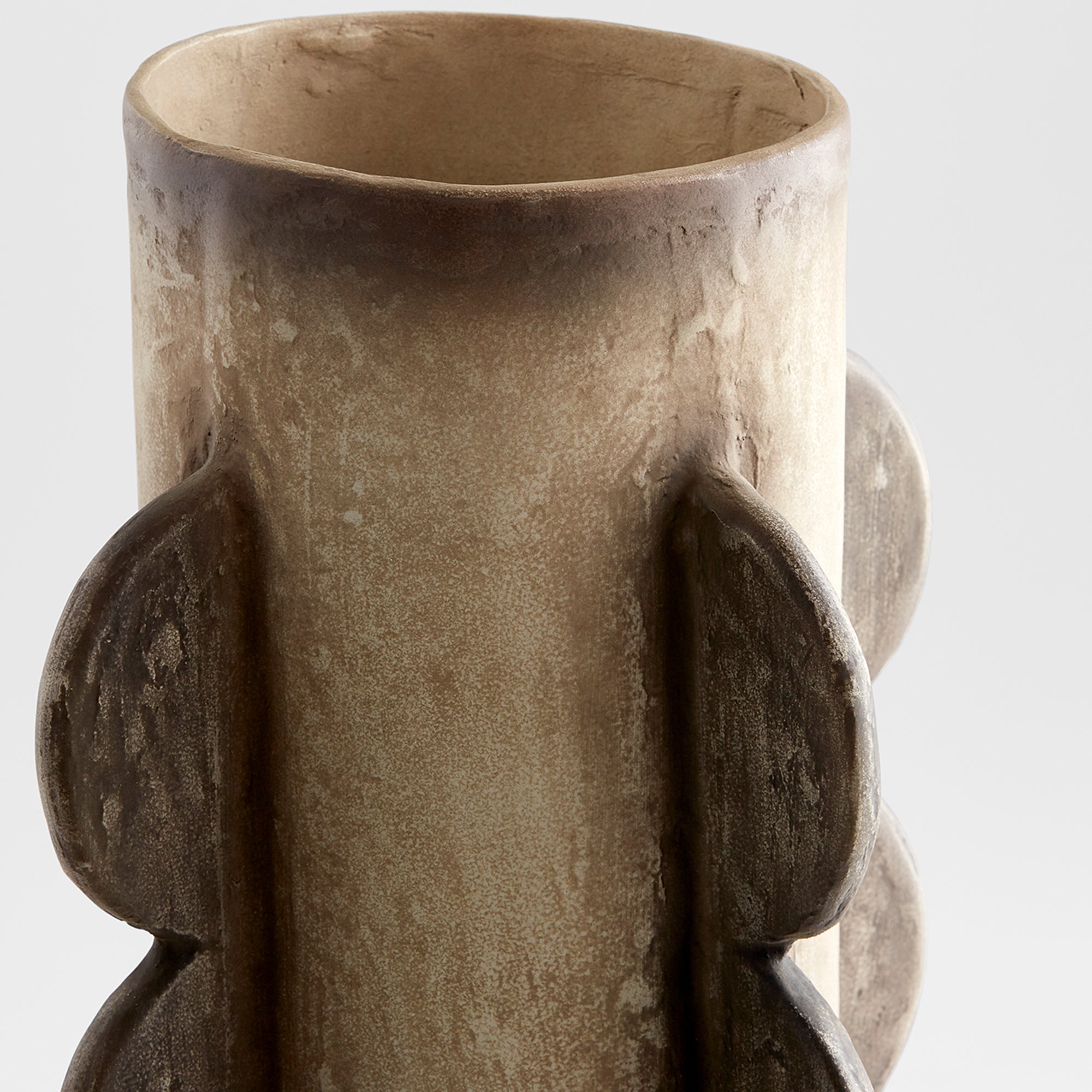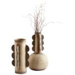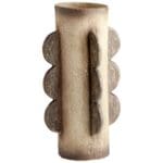 This artisan crafted cement vase collection features a rustic grey finish, with an abstract form influenced by ancient Native American pottery. A cylindrical design with a muted totem pole design, this collection is the perfect addition to any subdued organic ensemble, or boho-chic arrangement.