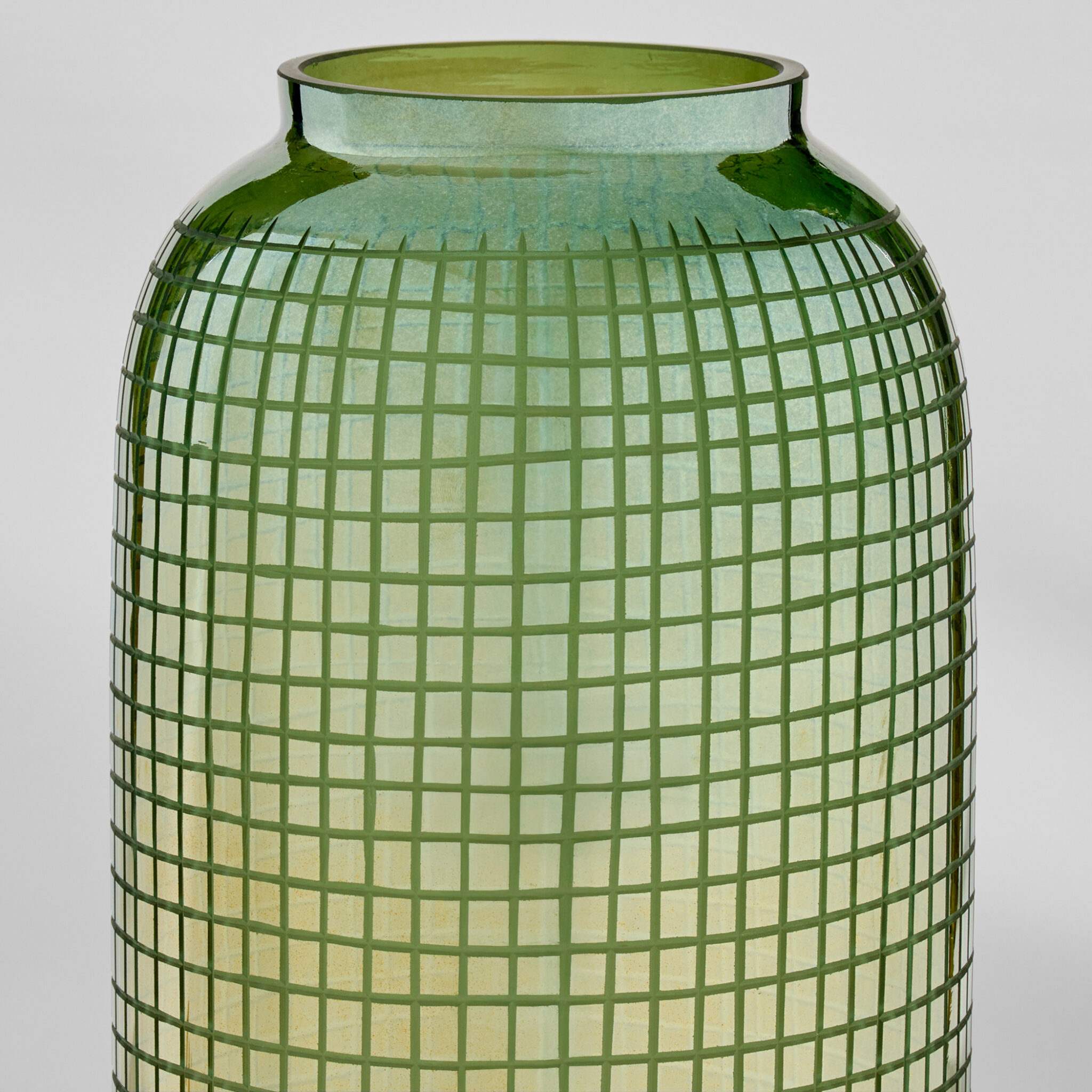The Modular vases combine iridescent grey ombre glass with metallic bronze, creating a striking contrast of hues. Inside, a grid detail is precisely etched, enhancing the visual complexity of the design. Crafted by skilled glass artisans, each vase is unique, with no two alike, showcasing exceptional craftsmanship. Available in three separate sizes.