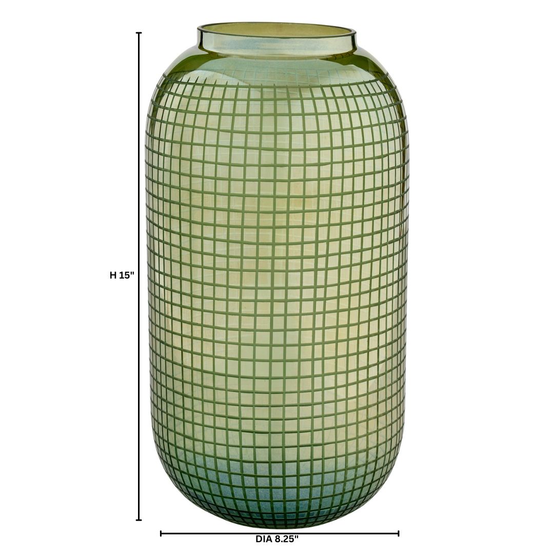 The Modular vases combine iridescent grey ombre glass with metallic bronze, creating a striking contrast of hues. Inside, a grid detail is precisely etched, enhancing the visual complexity of the design. Crafted by skilled glass artisans, each vase is unique, with no two alike, showcasing exceptional craftsmanship. Available in three separate sizes.