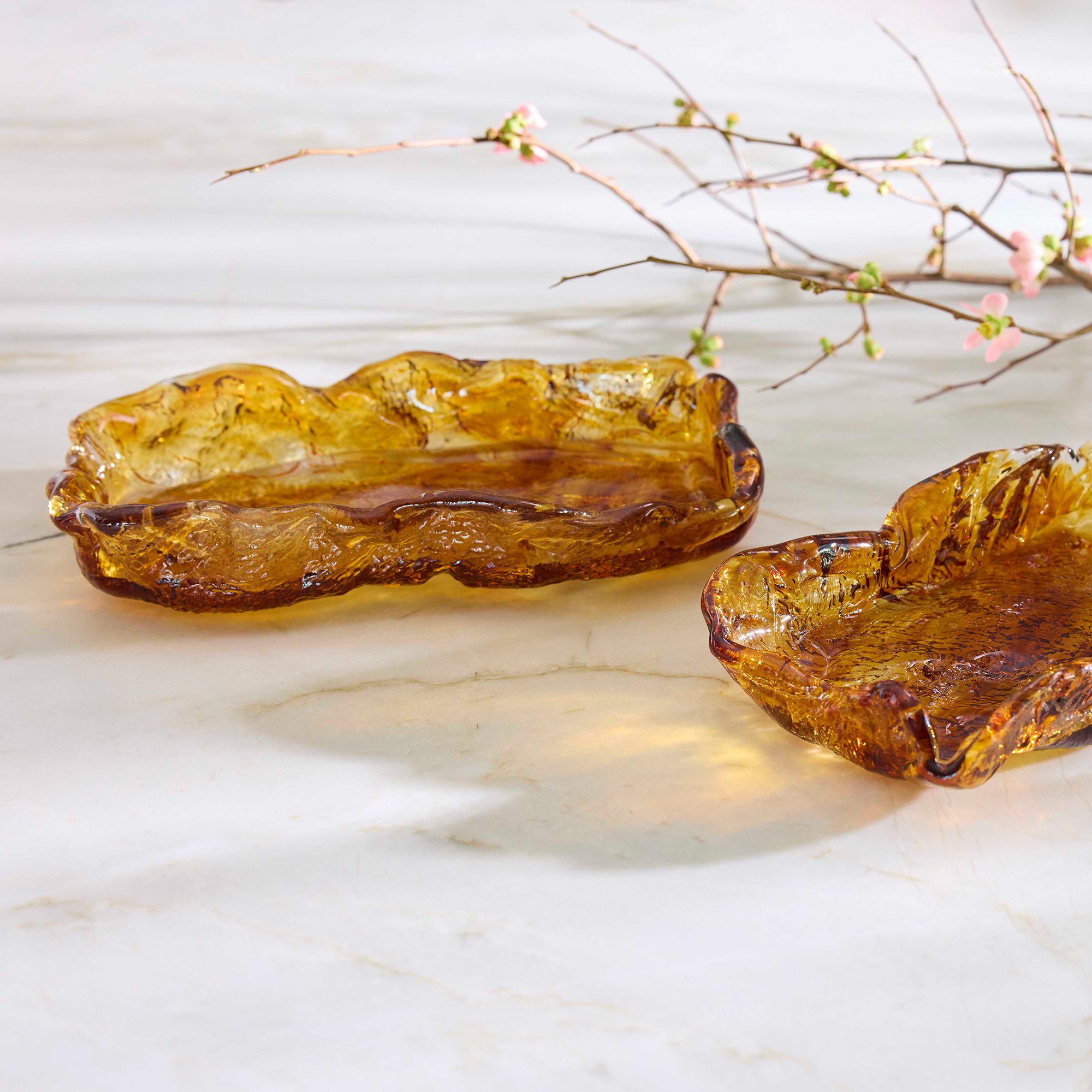 The Molten collection is a stunning embodiment of craftsmanship and artistry. Each piece is crafted using the ancient technique of sand casting, resulting in thick, textured glass that produces a symphony of light play. The sand casting process lends each piece a unique character and depth, with imperfections that enhance its natural beauty. Elevate your design with the timeless allure of the Molten collection’s amber glass trays. Available in two sizes.