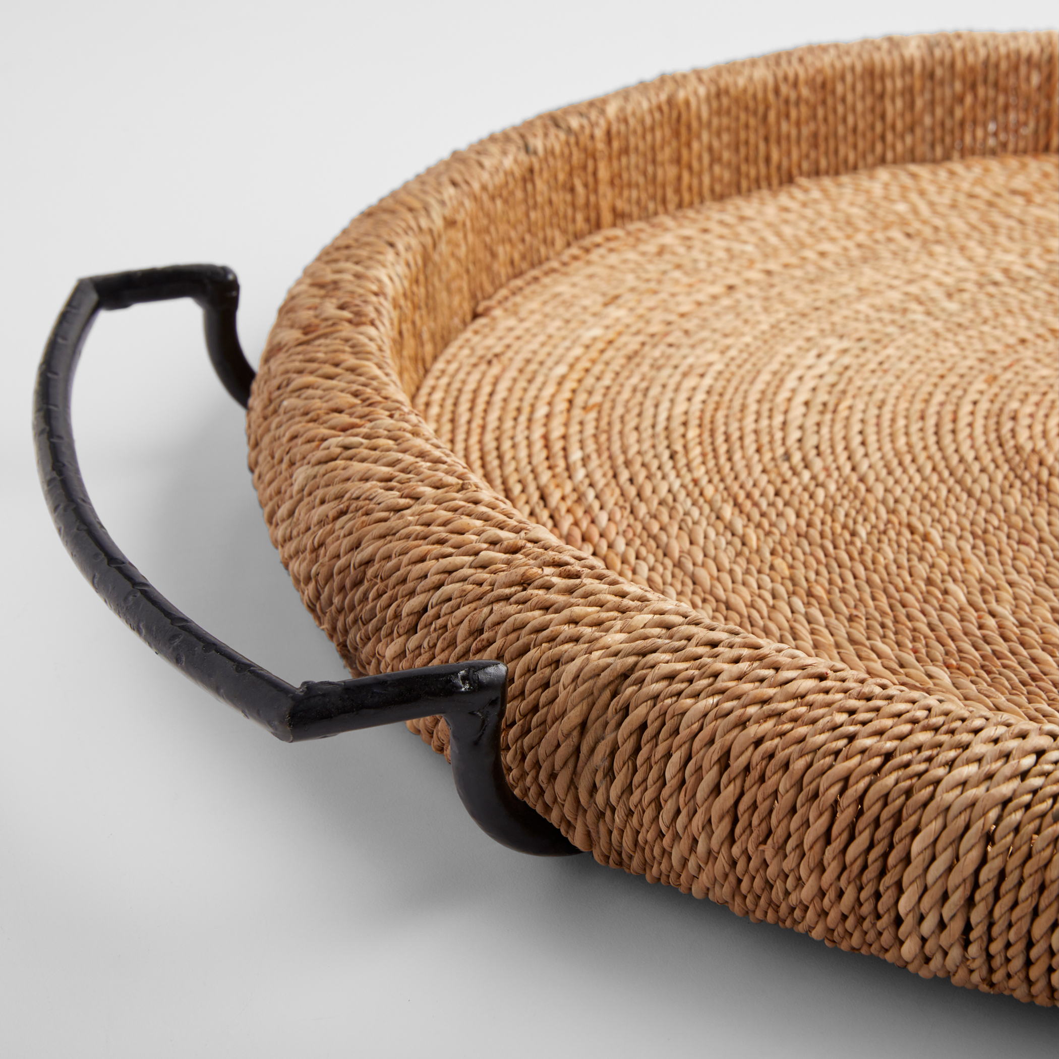 The Montego Trays feature a woven surface with black metal handles, offering generous scale and exceptional quality. Versatile in use, they transition effortlessly from serving trays for entertaining to stylish ottoman trays, all while exuding a relaxed feel with their rich materials.