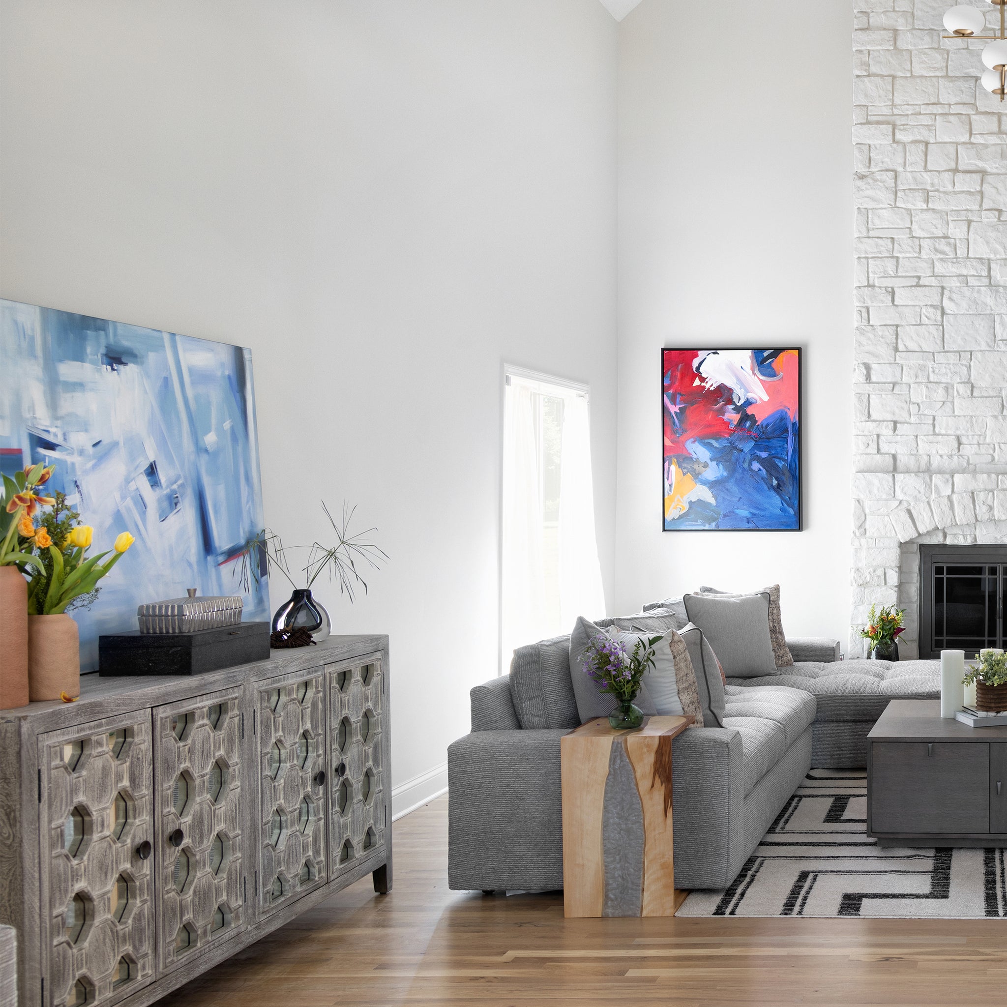 The alluring oblong shapes of the Moraea art glass vases are on trend with the latest styles and make an elegant contribution to any space. The distinction between the encased interior splash of blue and the smooth, clear exterior makes these one-of-a-kind accent pieces. The perfect reservoir for a colorful bouquet of your favorite flowers. No two are alike.