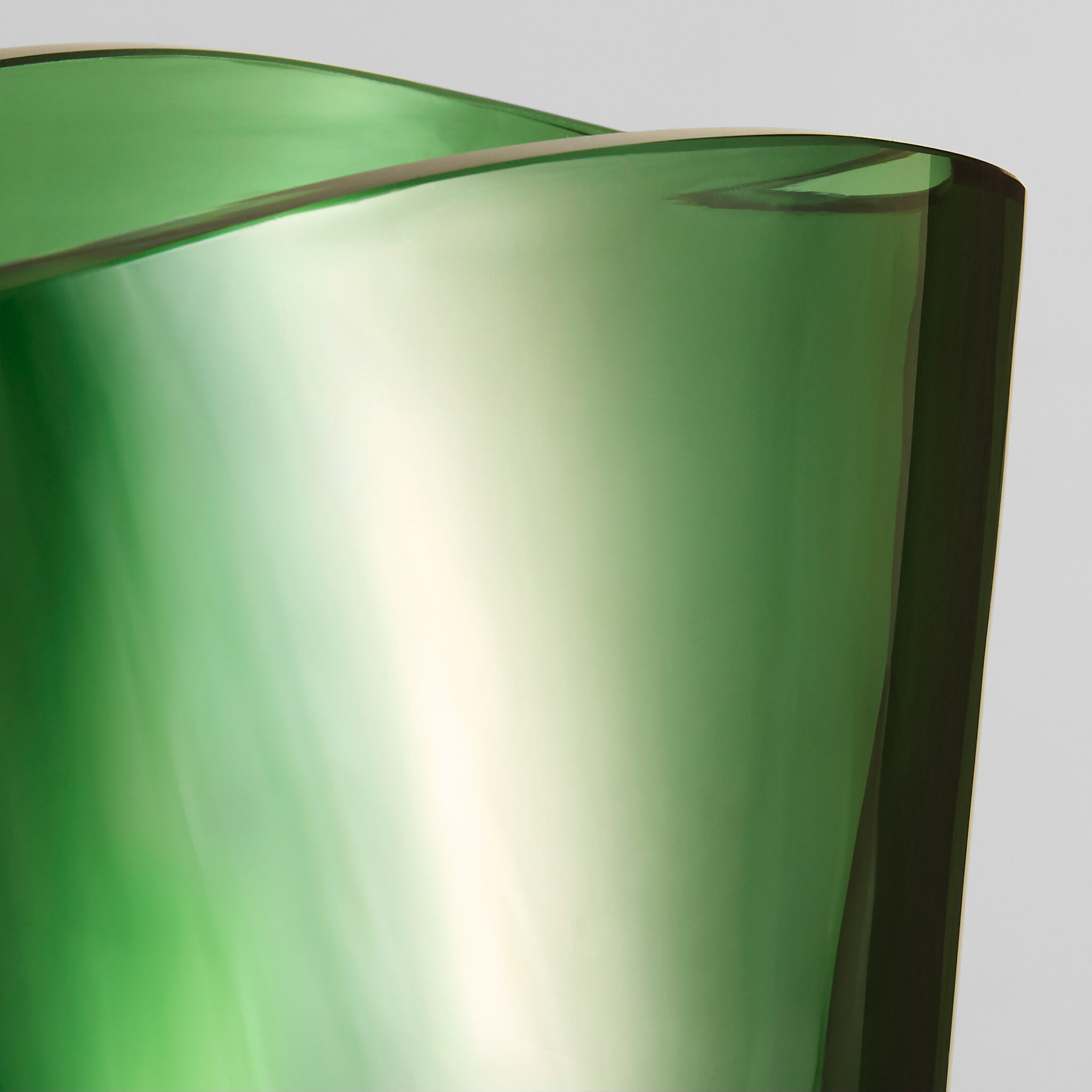 The Muzo Vase is a stunning blend of artistry and craftsmanship, featuring hand-blown clear glass base holding an emerald green vase, creating depth and vibrancy. The Muzo Vase is available in three sizes.