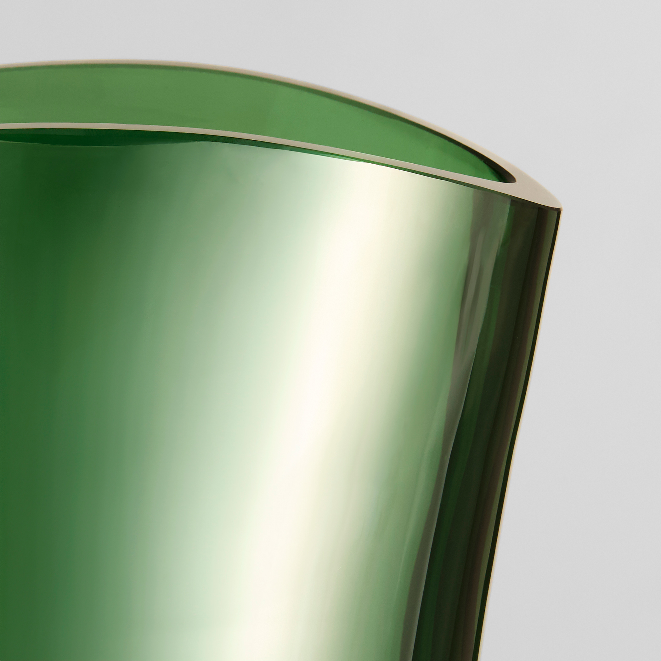The Muzo Vase is a stunning blend of artistry and craftsmanship, featuring hand-blown clear glass base holding an emerald green vase, creating depth and vibrancy. The Muzo Vase is available in three sizes.