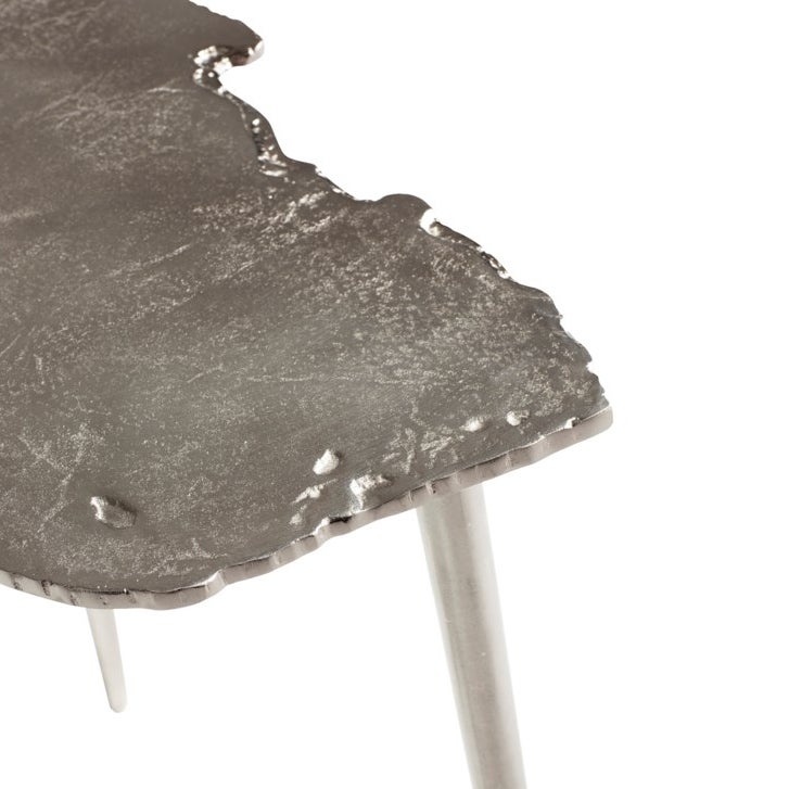 This table top features a unique and organic shape. It its freely formed to create a sense of movement and tranquility. Supported by three solid legs. This table is the perfect fit for any living room or entry way. Great for residential or commercial use.