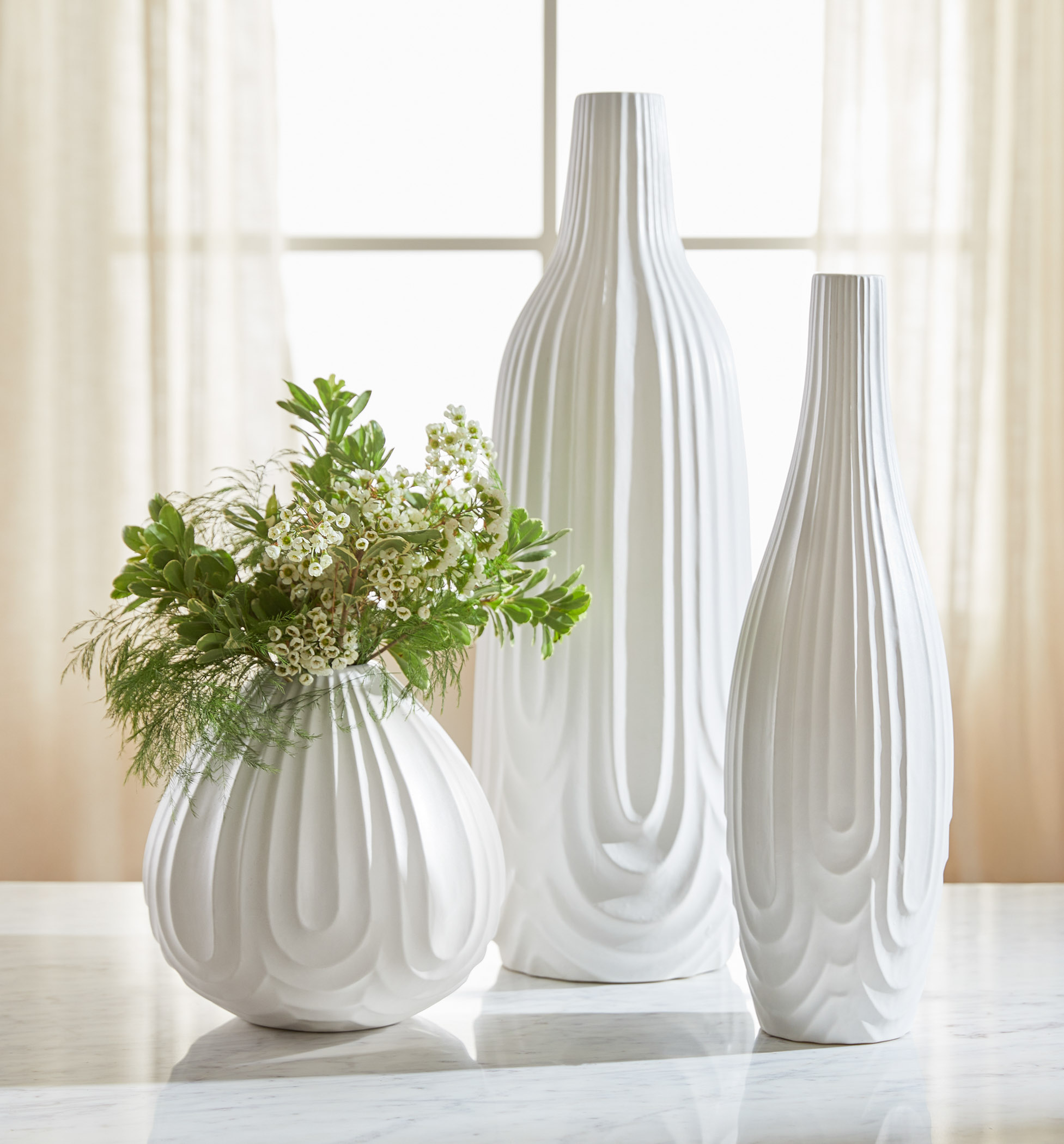 The Nigel Vase, crafted from earthenware, features a sleek white finish that complements any d?cor. Its debossed texture adds a subtle but striking visual element. Available in multiple size and shape options, it works perfectly as a standalone piece or grouped for a layered effect, adding modern elegance to any room.