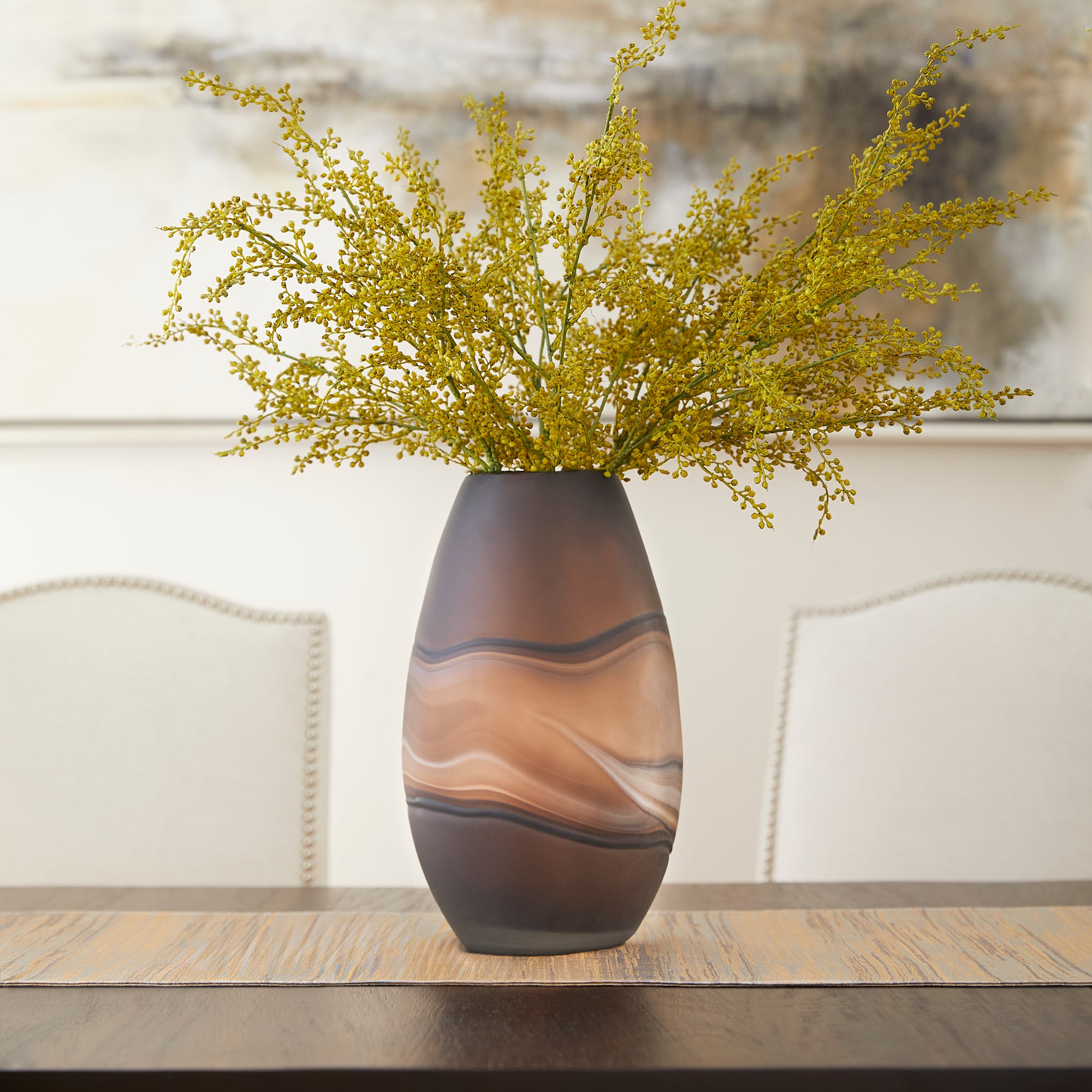 Add an abstract design to your tabletop ensemble with the Nina vase. Available in three different size options, these organic and earth toned accents feature a swirled matte glass surface, that blends brown and khaki tones from top to bottom. These contemporary vessels are ideal for your spring floral arrangements. Perfect for any style design: contemporary, traditional, or transitional, these glassware pieces will fit your needs.