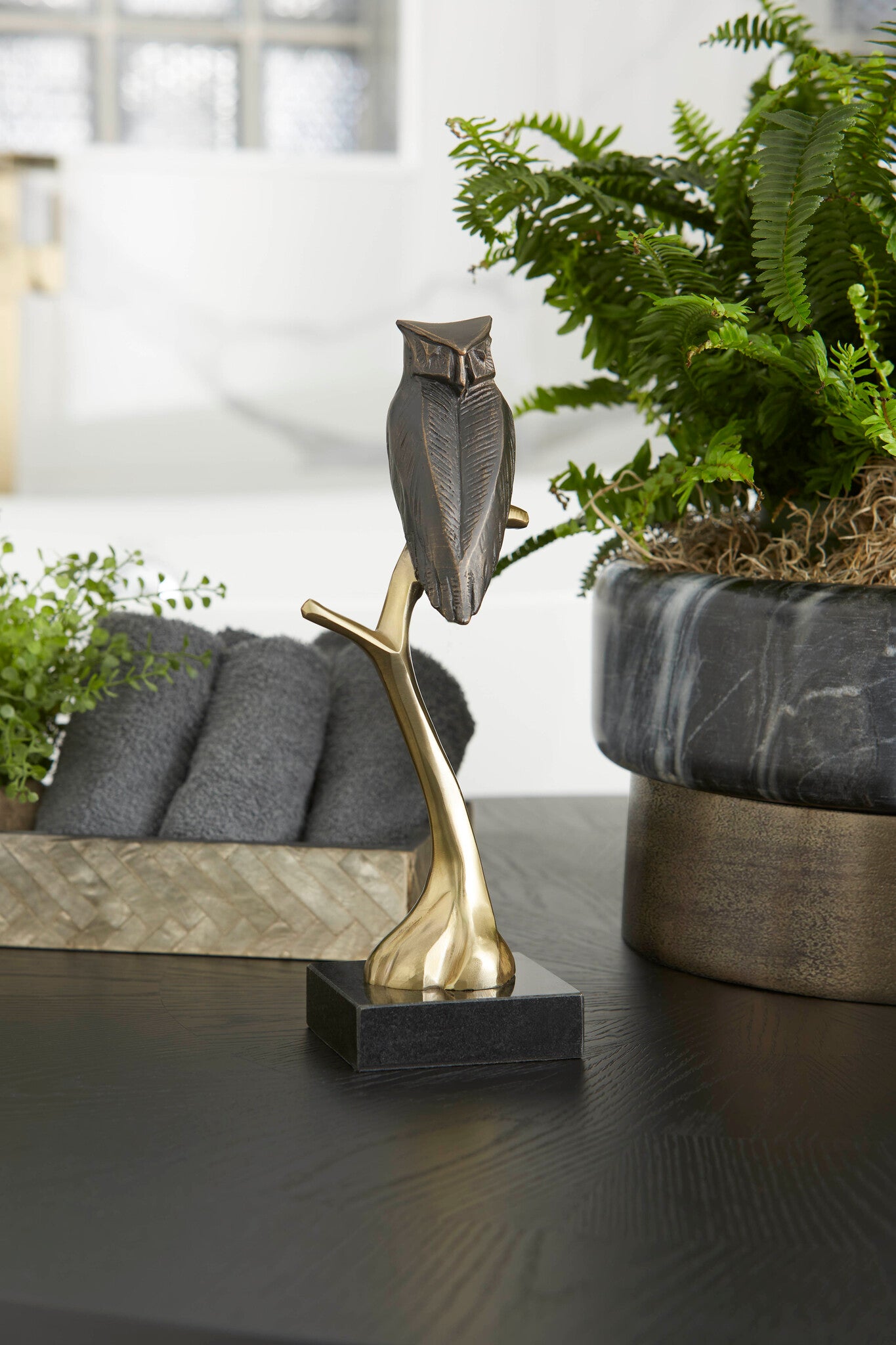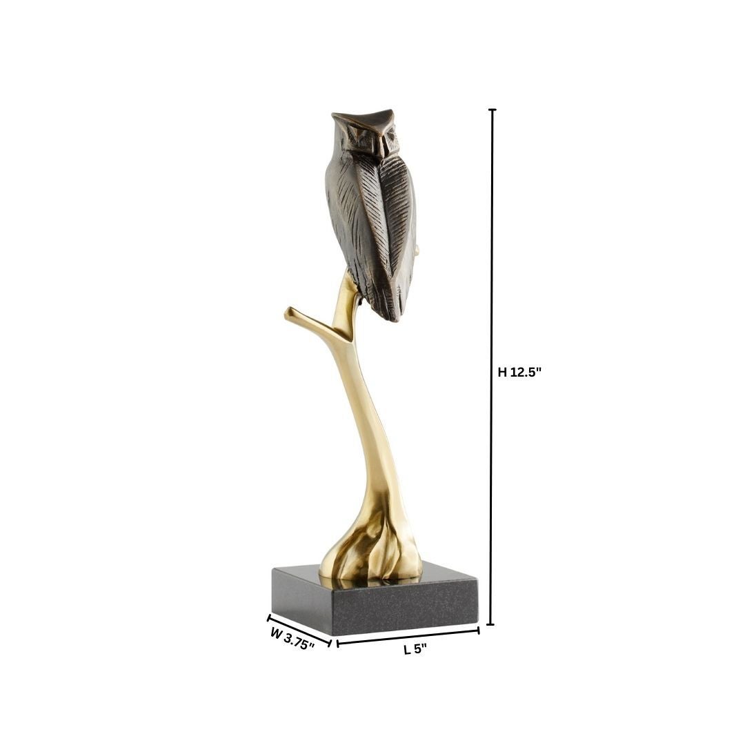 “The sand-cast Nocturnal sculpture is a fusion of artistry and elegance. This hand-sculpted owl, finished in a rich antique bronze, gracefully perches on a polished brass stand. Resting on a sleek black marble base, this sculpture is perfect for those who appreciate the finer things in life. Elevate your decor with this captivating symbol of wisdom and beauty.”