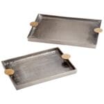 Eclectic-industrial style meets art deco beauty in this silver and gold finished tray. Crisp, clean lines smoothly highlight the surface texture and textured metal geometric handles provide added detail. Dish up delicious cocktails anytime or display your beautiful, jewelry on this stunner. Available in two size options for added versatility, the Obscura tray is sure to add some panache to your ensemble.