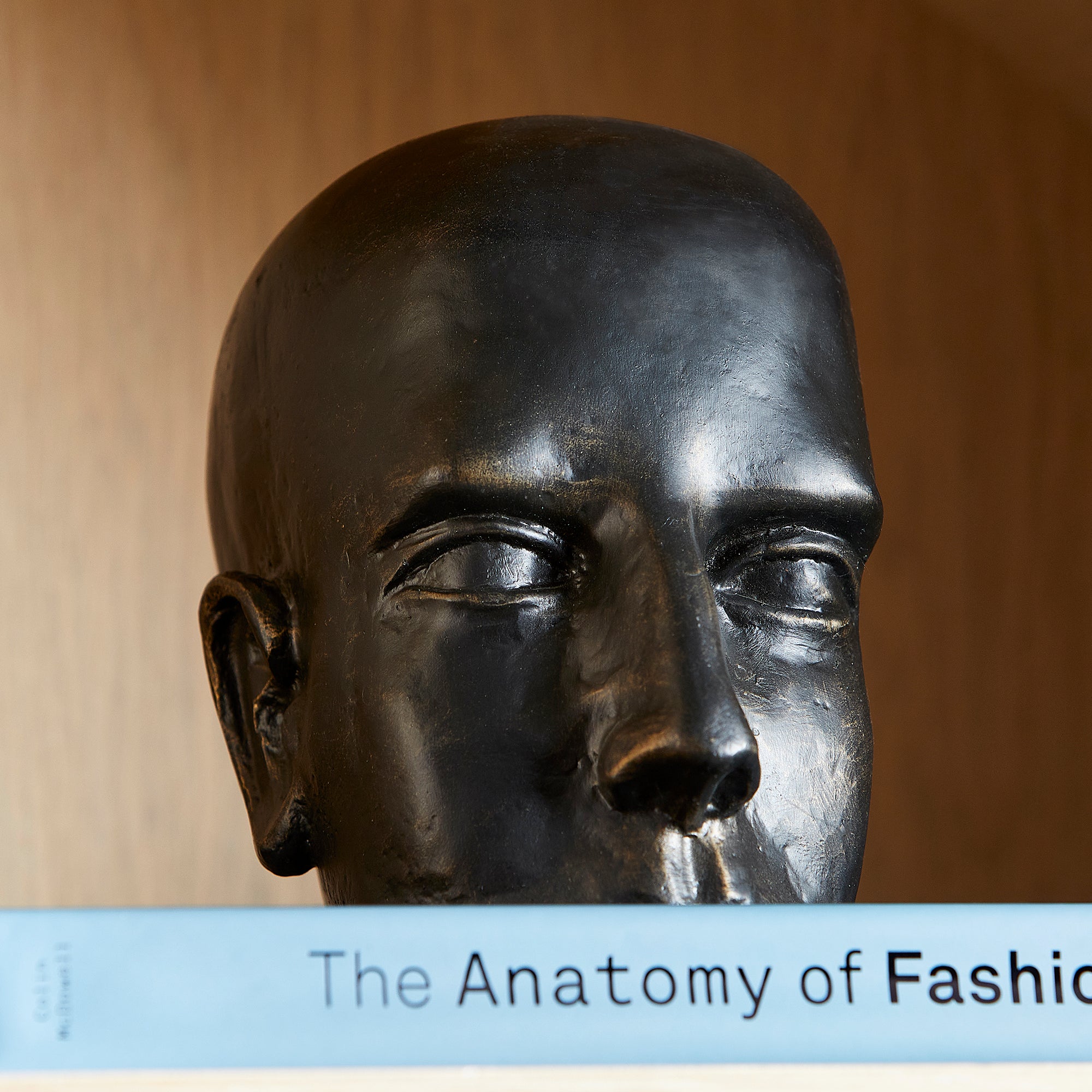 An arrestingly modern interpretation of a bust style artwork gives this face focused sculpture an unusual bearing. Old world finished iron plumbs the depths of shadows and light to highlight intriguing elements.