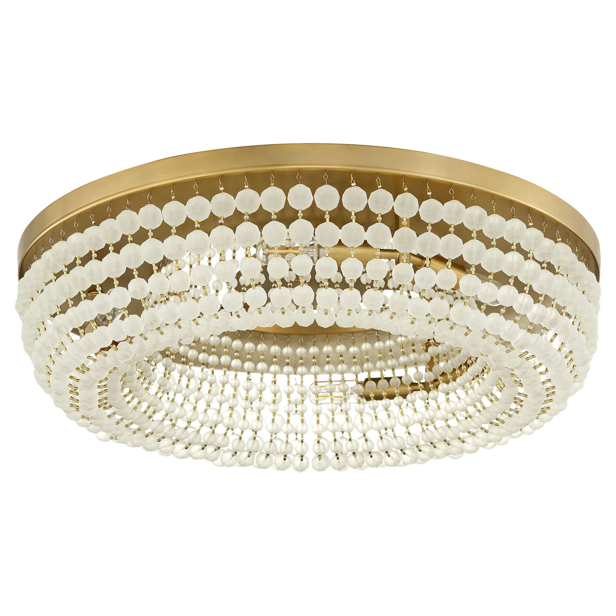 Elegant chains of frosted calcite beads drape from a circular frame in the Ophelia collection of luxury lighting. These damp-listed fixtures boast a durable steel frame with an aged brass finish that houses candelabra sockets. Choose from a flush mount and two styles of pendant lights and add vitreous luster and delicate detailing to your interior design project.