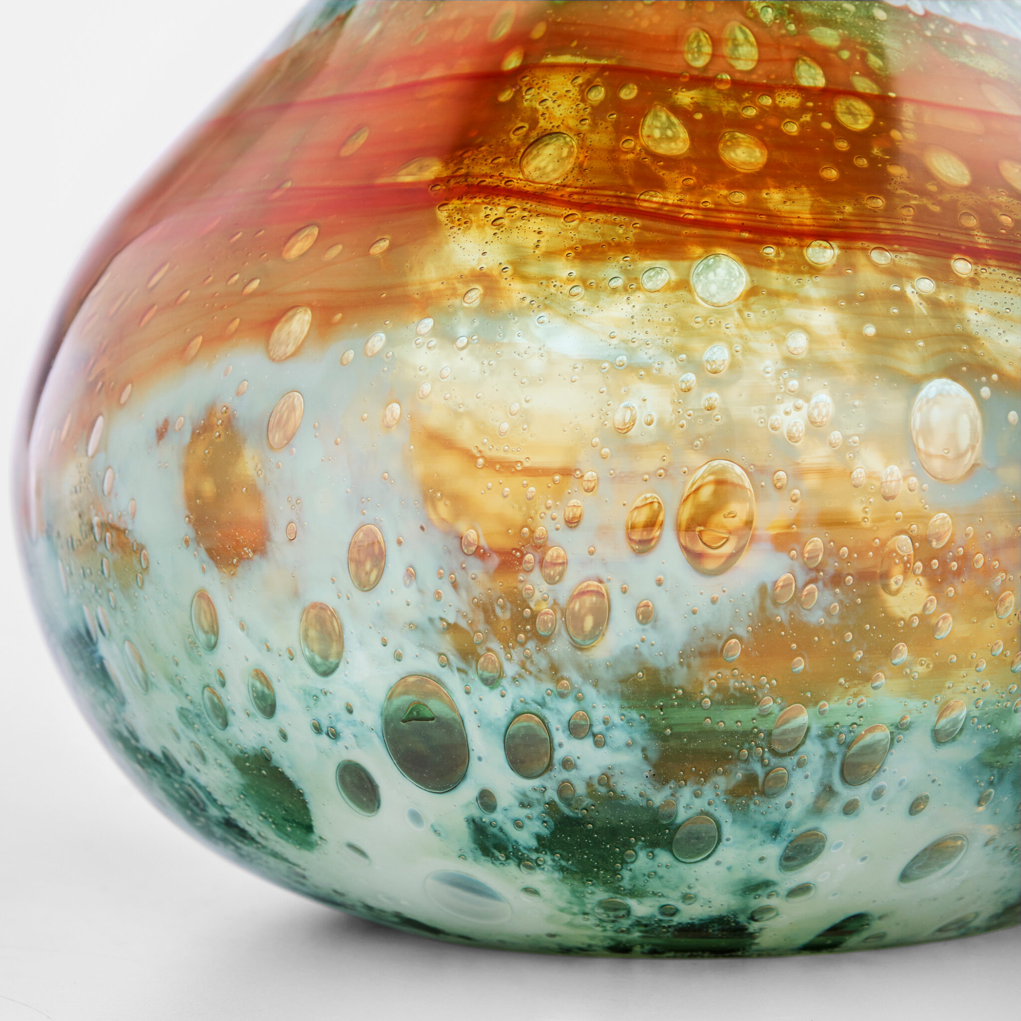 Dark grey lines trace their way across the surface of the Pacaya Bottle vases, while molten orange is layered onto the light grey glass base. These long-neck vases are crafted by two artisans working in tandem to create a dynamic fusion of color and craftsmanship, each showcasing its distinctive character and variation. Available in three separate sizes.