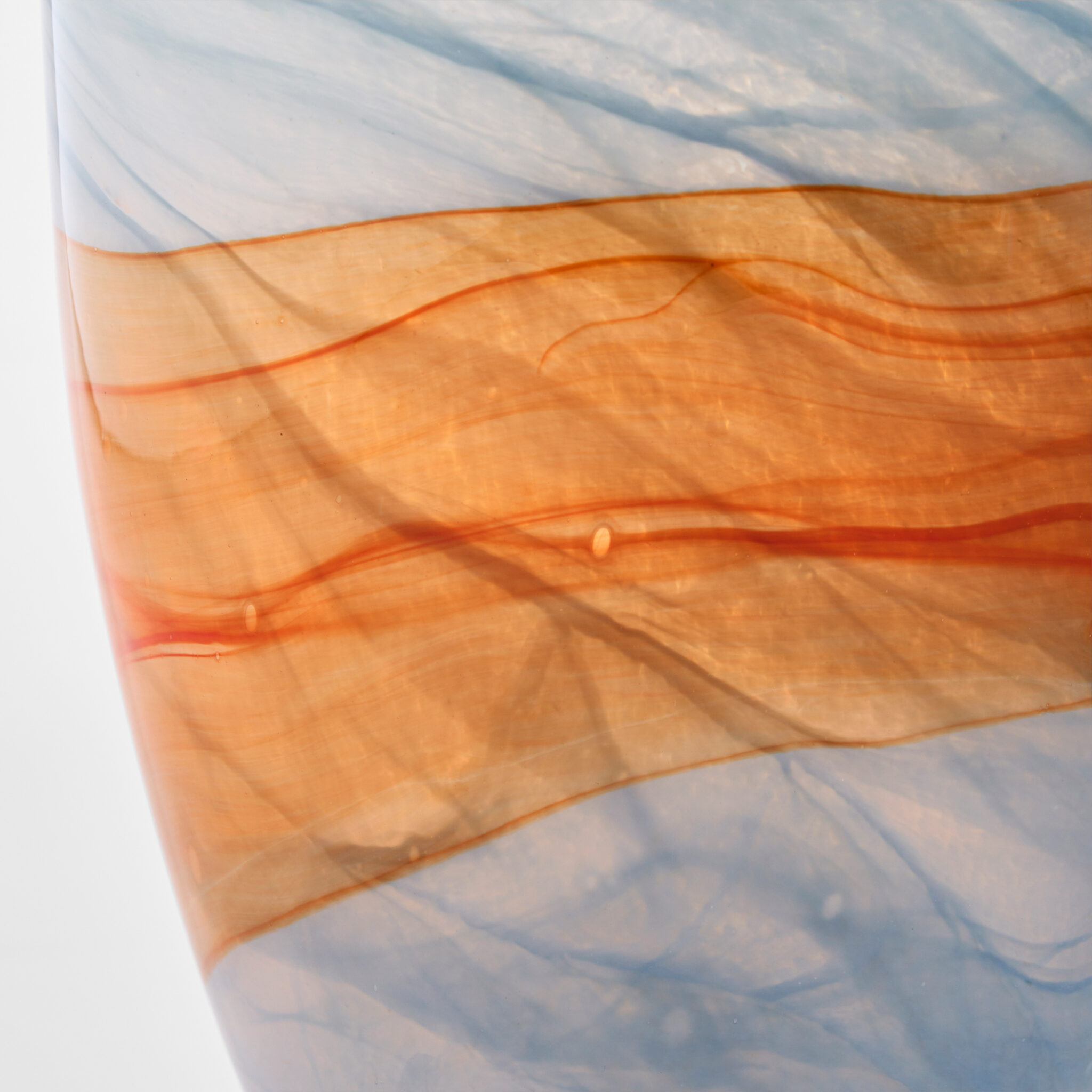 Dark grey lines trace their way across the surface of the Pacaya vases, while molten orange is layered onto the light grey glass base. These large-scale, open-mouth vases are crafted by two artisans working in tandem to create a dynamic fusion of color and craftsmanship, each showcasing its distinctive character and variation. Available in two separate sizes.