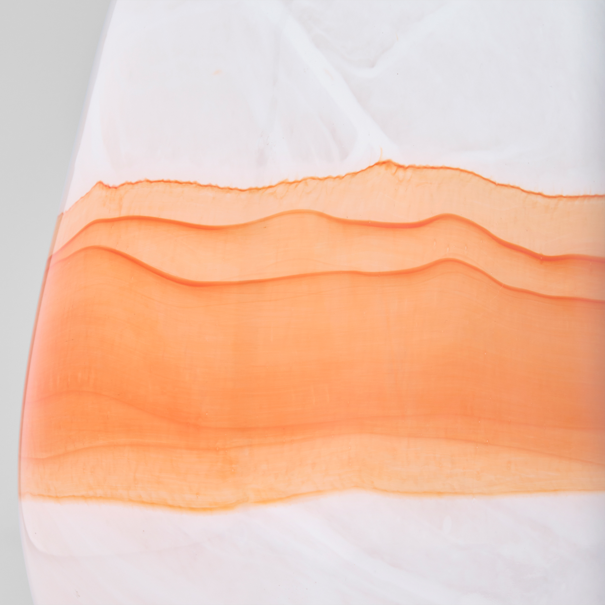 Subtle grey lines add depth and movement to the Pacaya vases. As molten orange glass is layered onto the white opalescent vase, two artisans work in tandem, carefully overlaying the vibrant hue. The result is a dynamic fusion of color and craftsmanship, with each vase showcasing its own distinctive character and artistic variation. Available in three separate sizes.