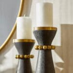 Named after the multi-armed Goddess of Beauty, The Parvati candleholders’ distinct shape resembles a woman’s wrist adorned with a lavish bracelet. Hand-carved Mango wood is detailed with a string of bead-like carvings that are hand-wrapped in cladding. Available in combinations of weathered grey and antique nickel or rubbed black and antique brass, these candleholders make a statement in many different settings. The Parvati collection contains three sizes allowing for display in multiples.