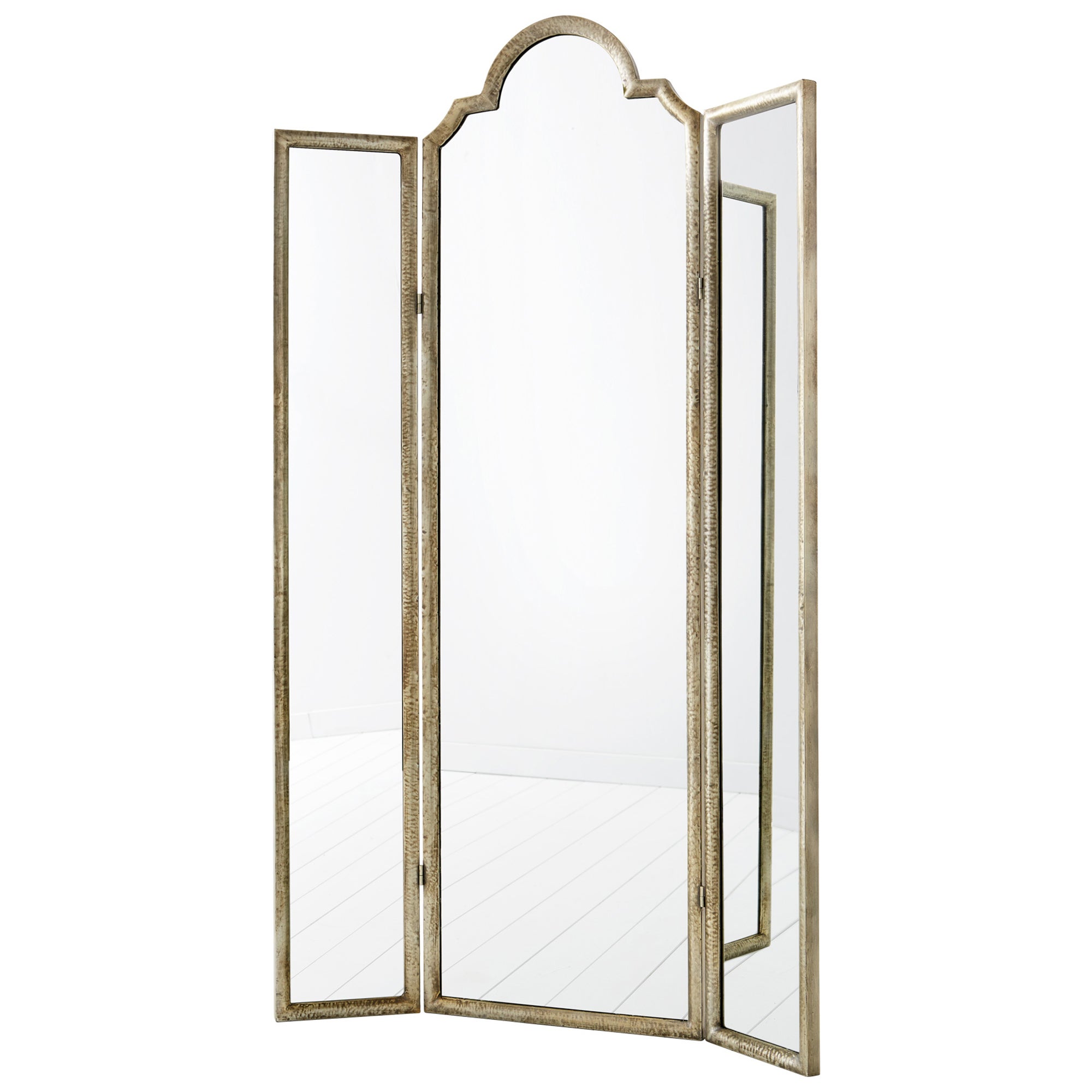Put the finishing touch on any vintage-inspired room with this beautiful silver three-way floor mirror. Long rectangular shapes are joined together and topped with a classic Victorian-like silhouette.