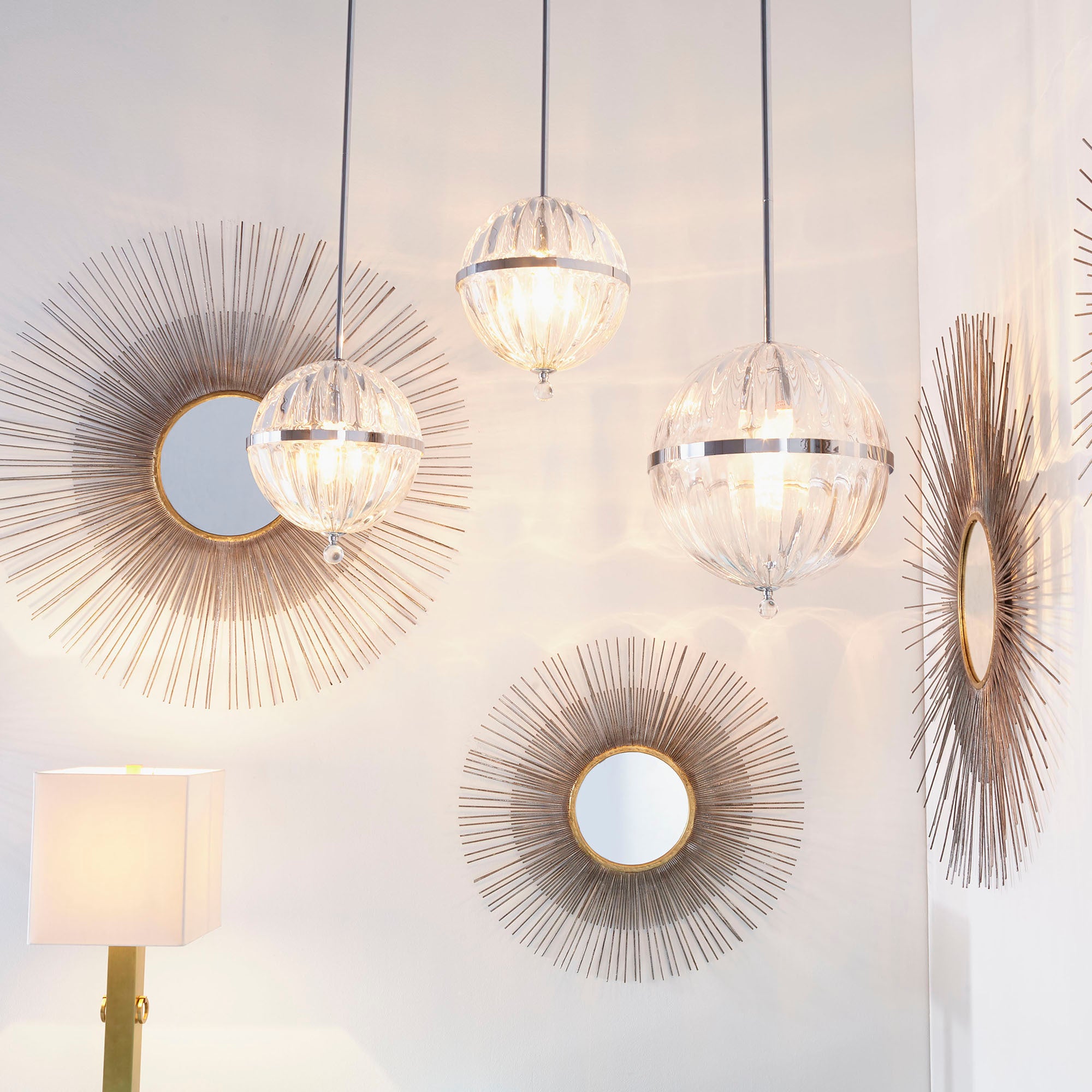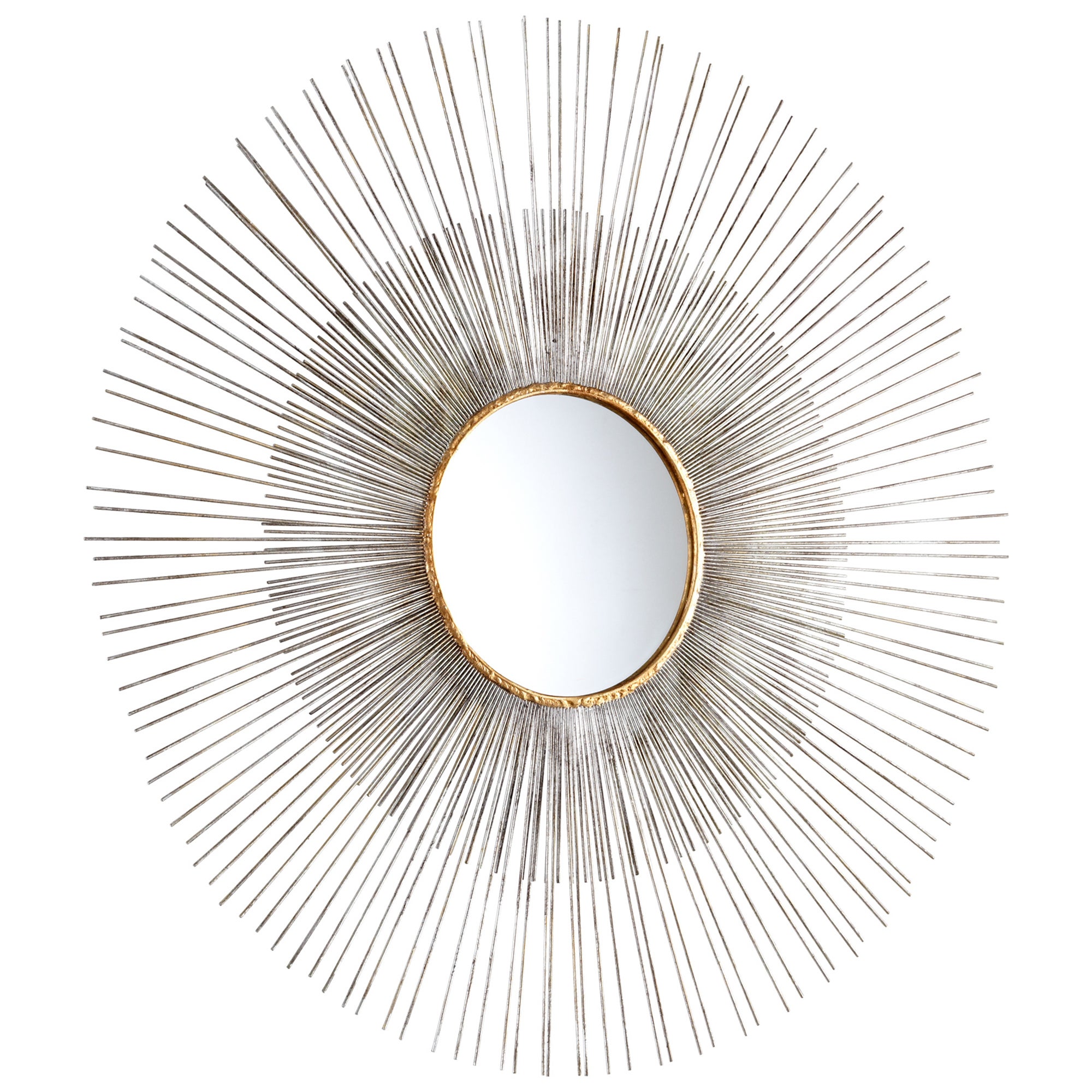 A ring of thin, elongated iron lines emerges from the geometric center of this large antiqued silver leaf mirror. Layers of thin metal bring a delicate touch to any living room.