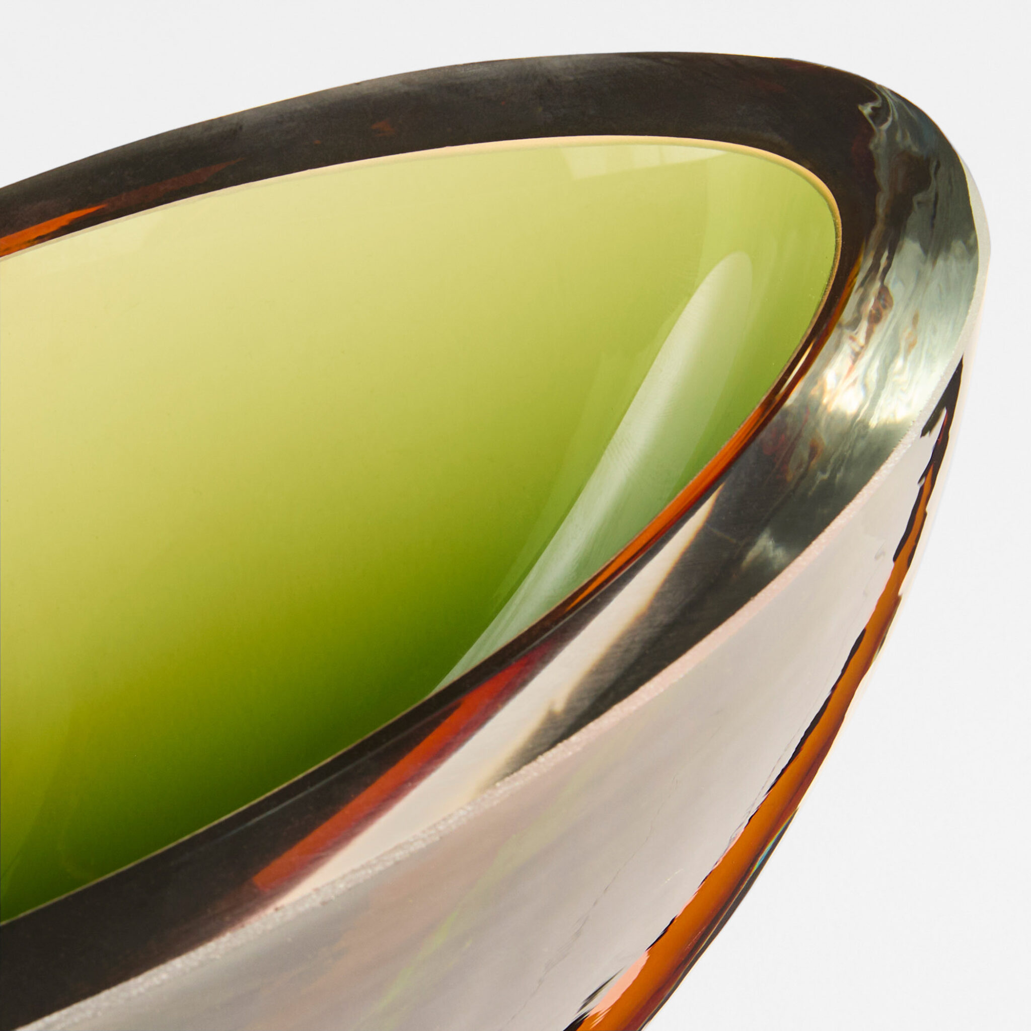 The Pluto Bowl, named after the distant yet unforgettable planet, is expertly handblown art glass and features striking layering in rich green and orange hues. Its bold design mirrors the planet’s intriguing presence, making it a captivating focal point that leaves a lasting impression, much like the planet itself.