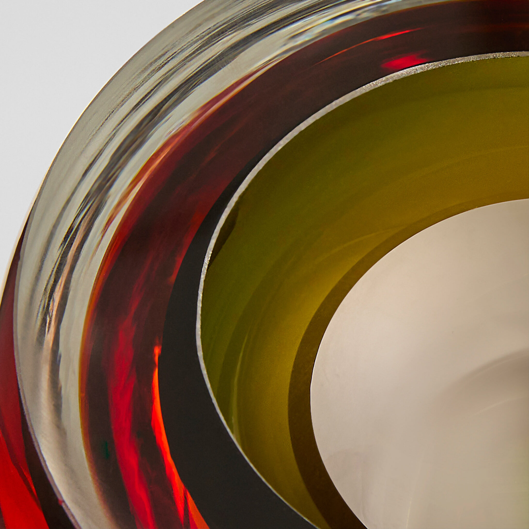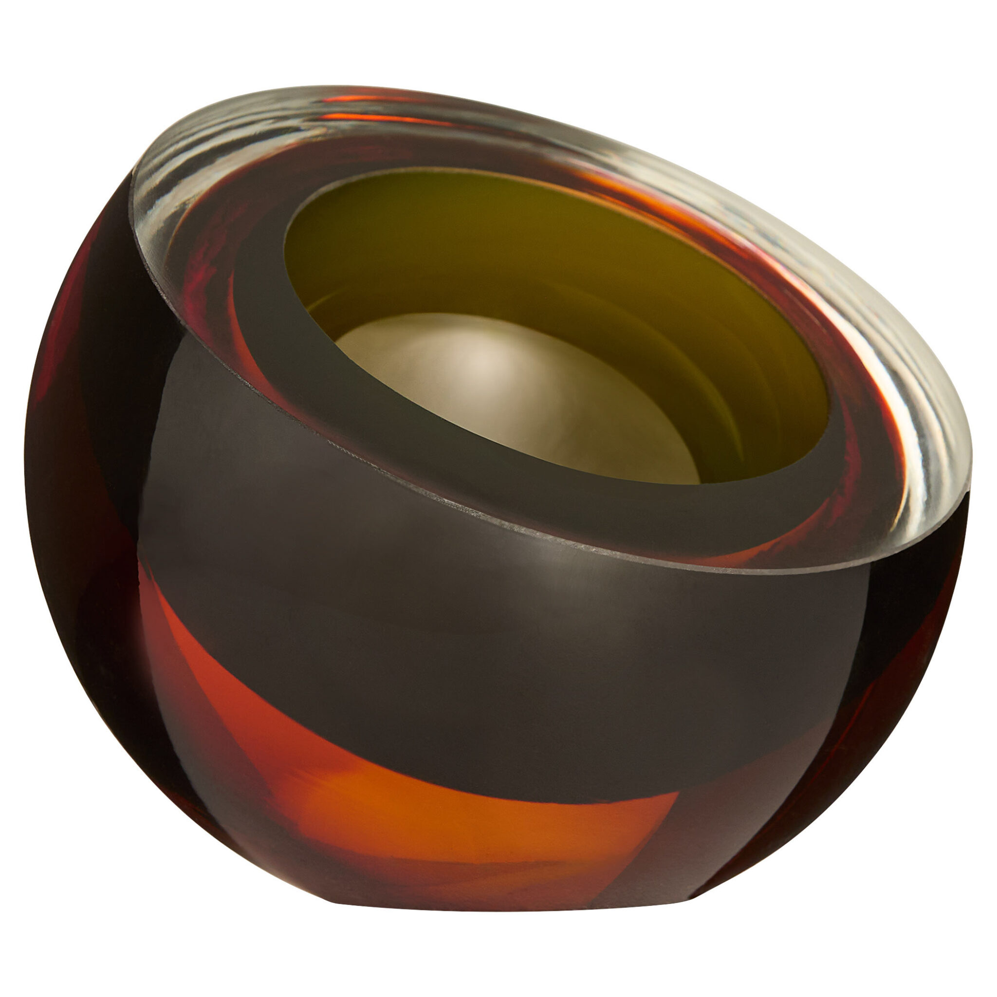 The Pluto Bowl, named after the distant yet unforgettable planet, is expertly handblown art glass and features striking layering in rich green and orange hues. Its bold design mirrors the planet’s intriguing presence, making it a captivating focal point that leaves a lasting impression, much like the planet itself.