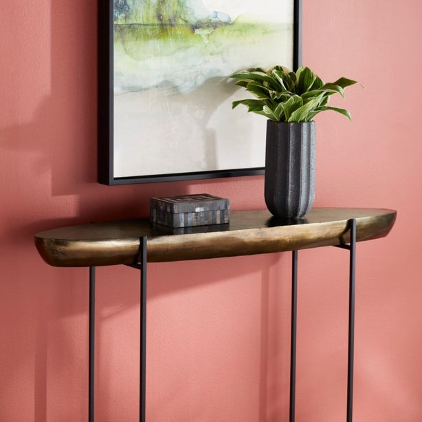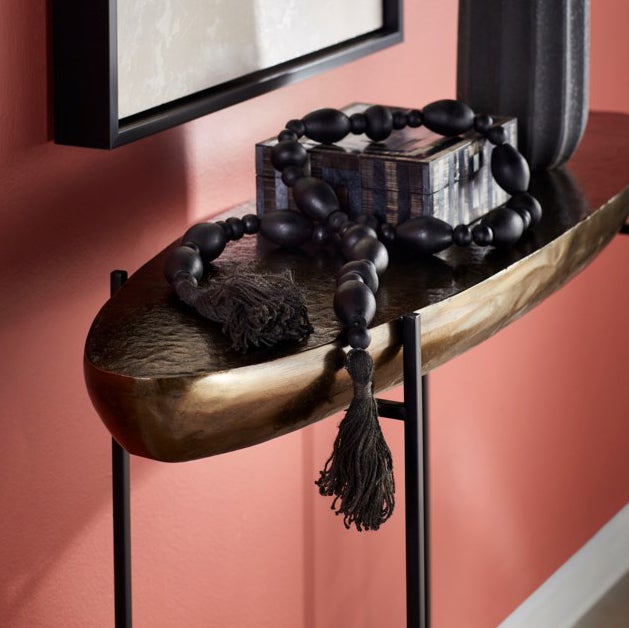This table is a large elongated oval form that is a solid piece held up by four dark thin legs. The contrast between the thick body of the table top and the thin lines of the standing the structure highlights the beauty of the top.