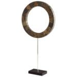 Evoke daydreams of transport to a new dimension with this large wood sculpture. Featuring an understated stand and stainless steel accent finish, the sculpture boasts a sleek open ring with a mottled brown finish offering depth and dimension.