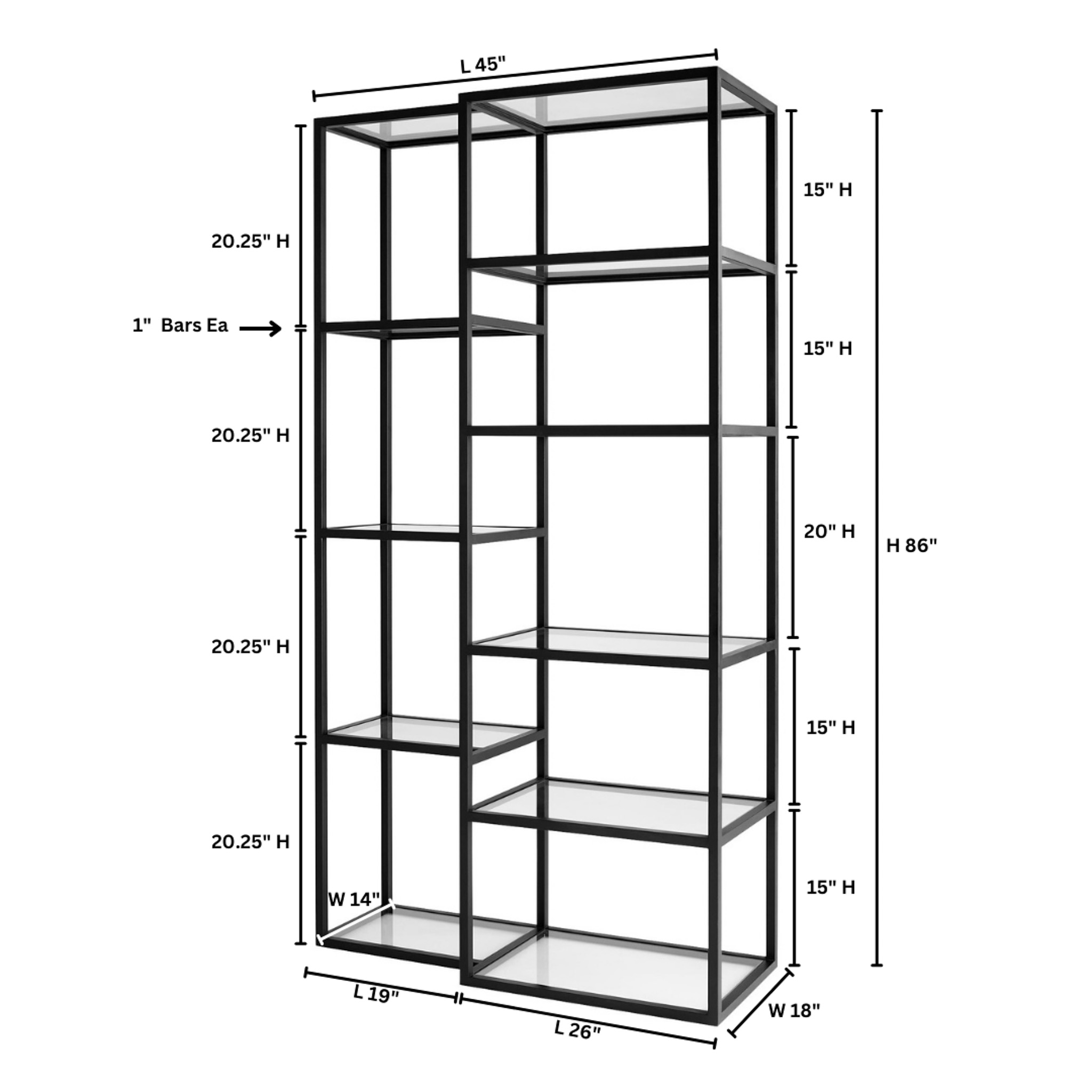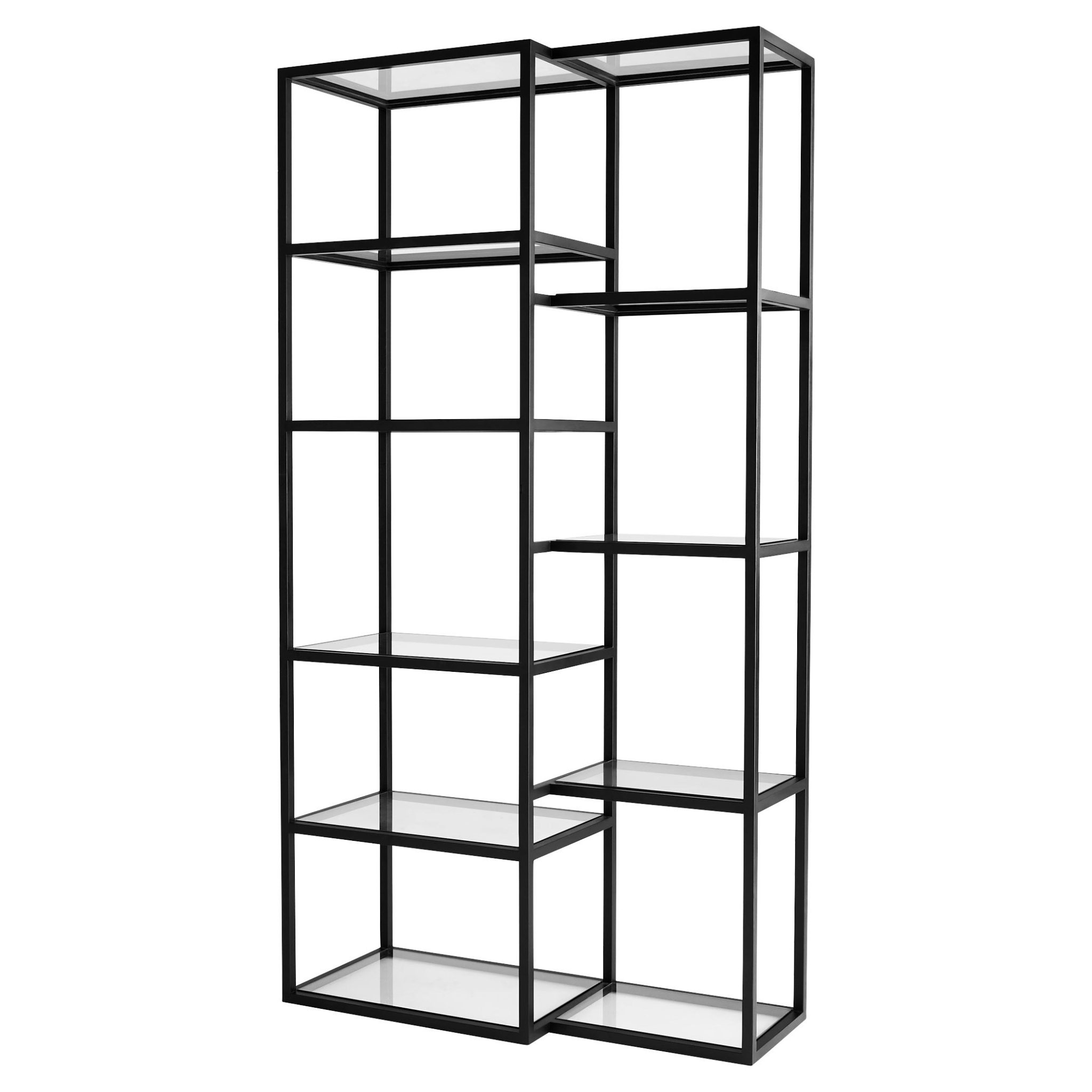 The Porter Etagere features fixed glass shelves, a matte black finish, and a square metal frame. Its two sections, with varying depths and shelf heights, add visual interest while accommodating larger accessories. Display it individually or pair two together, flipping one upside down to create one symmetrical unit that adds depth and dimension to your design. Both stylish and functional, it?s perfect for showcasing your favorite accents.