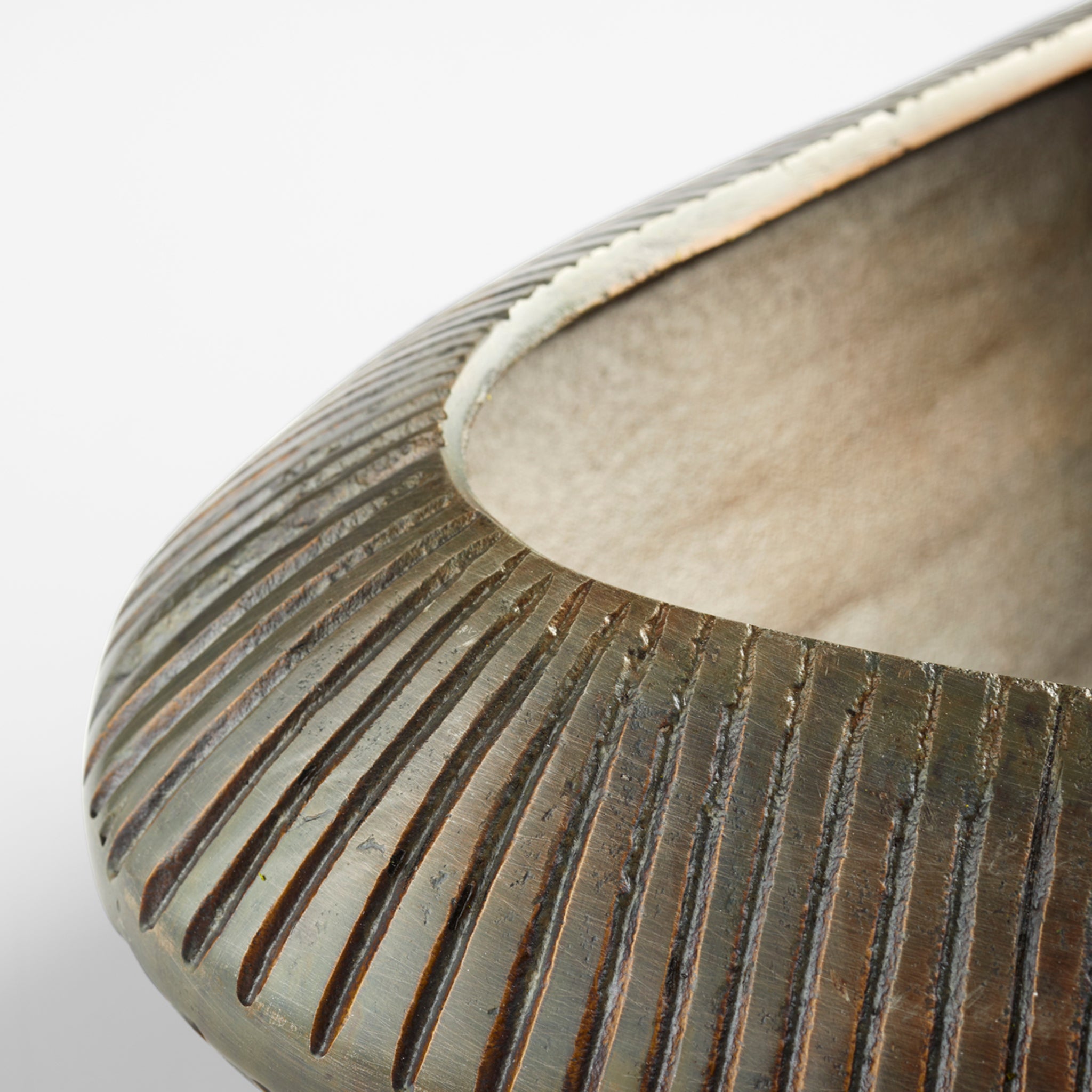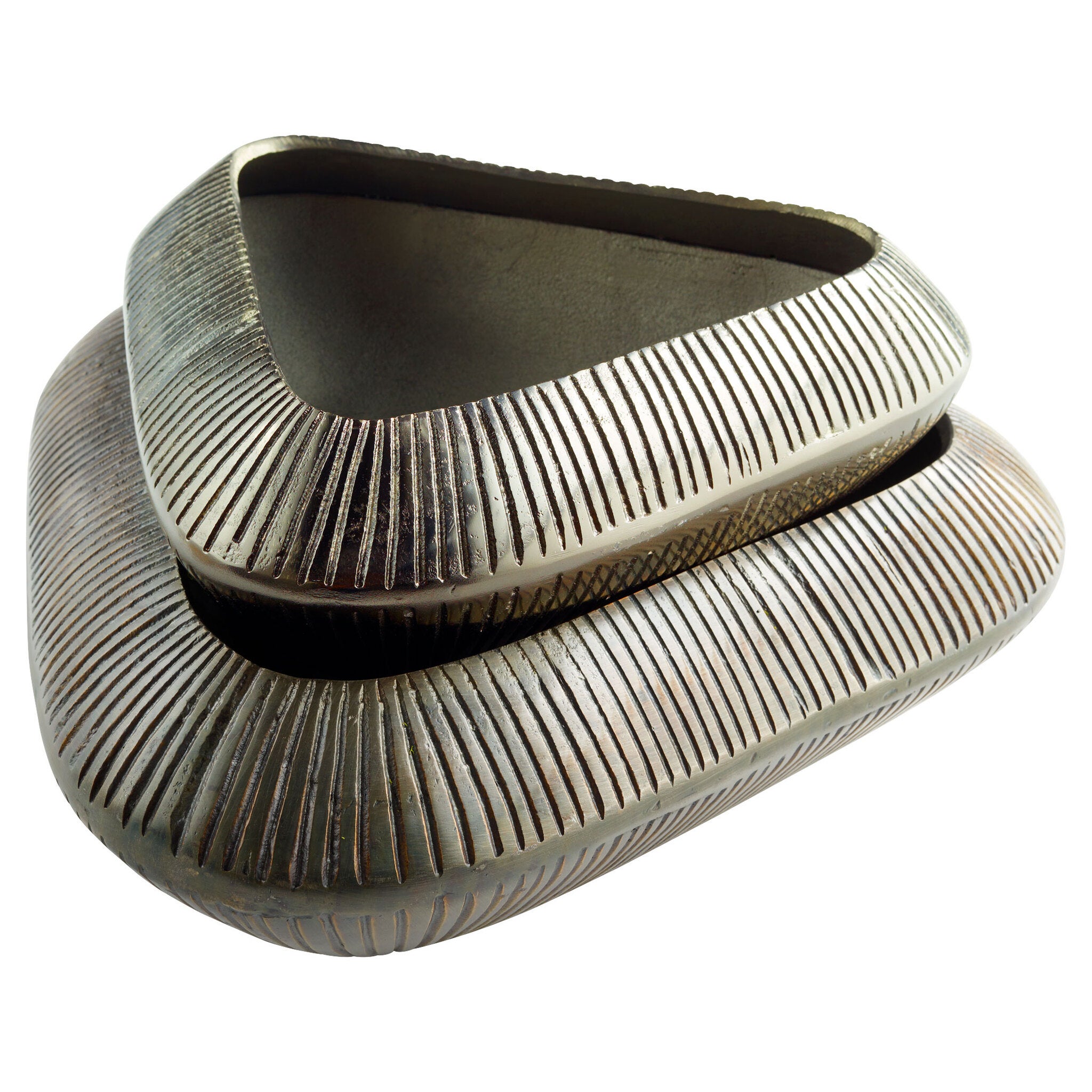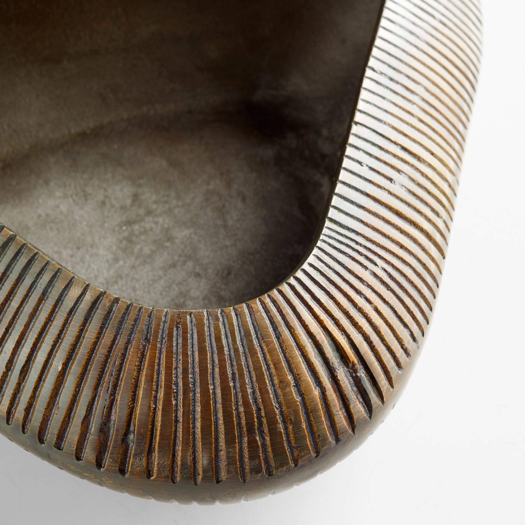 The Prism series is a collection of heavily textured and striated decorative bowls. Its signature triangular shape is constructed of durable cast aluminum in an antique bronze finish. Turn heads by showcasing these vessels as a table top accessories or by placing them on a large bookshelf.
