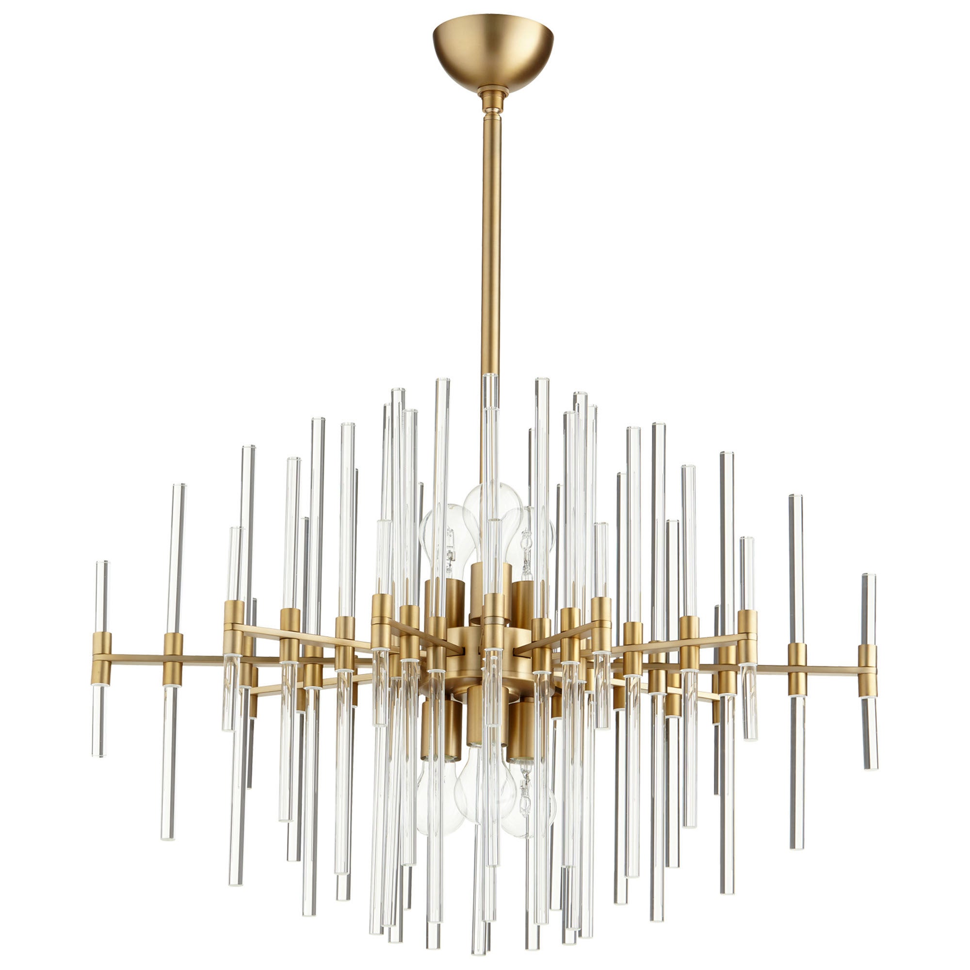 Enjoy the custom look of a dimensional light fixture. With linear styling, its glass rods in gradient sizes deliver an eye-pleasing geometric appeal. This six-light aged brass and glass pendant transforms a living or dining space.