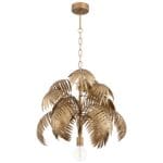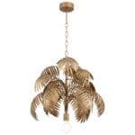 Add a touch of nature to your space with the addition of this gorgeous antique brass, patina chandelier. The light`s charming palm-like encasement is beautifully accented with a fully formed shape, diffusing a single 100W medium-base bulb. This lovely luminary will make a stunning addition to your rustic living room, eclectic kitchen space, or bohemian foyer.