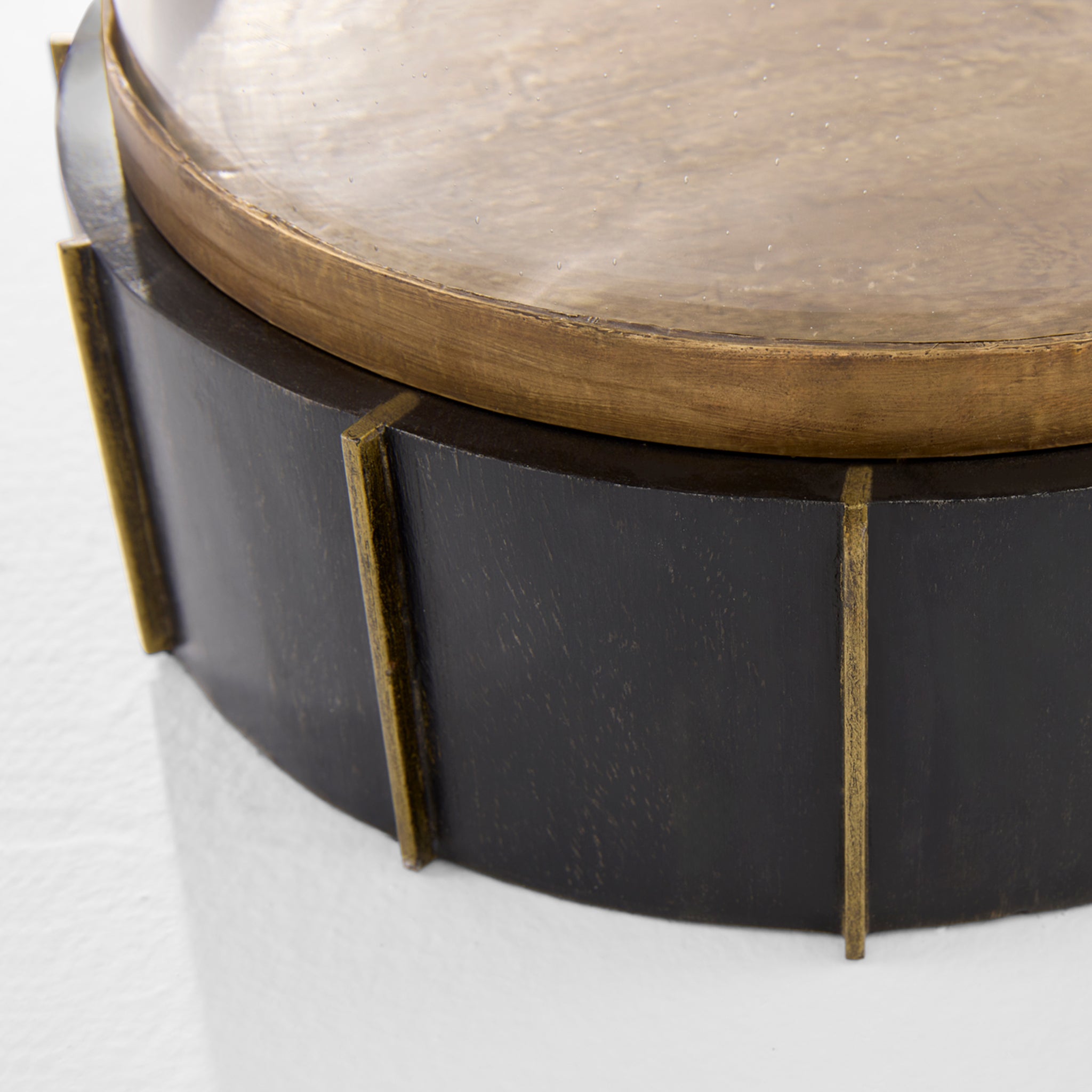 The Reed series of hurricane lamps make a dramatic statement as individual pieces or grouped in multiples. Three sizes of dark brushed mango wood columns are adorned with solid brass strips that are inserted into grooves along the body of the base. Brass detailing and rimmed candle platform are finished in antique brass. The series can be adapted for tabletop display indoors or underneath a covered outdoor area.