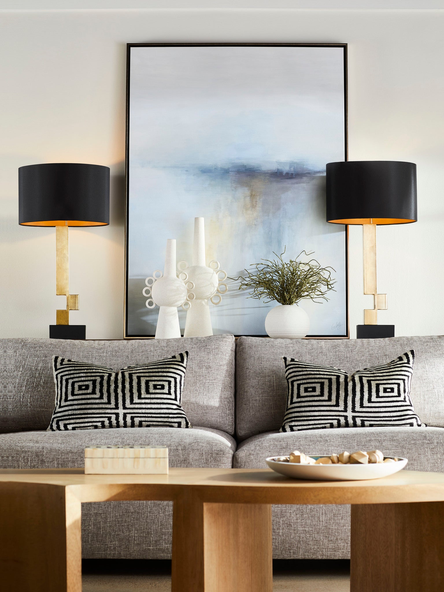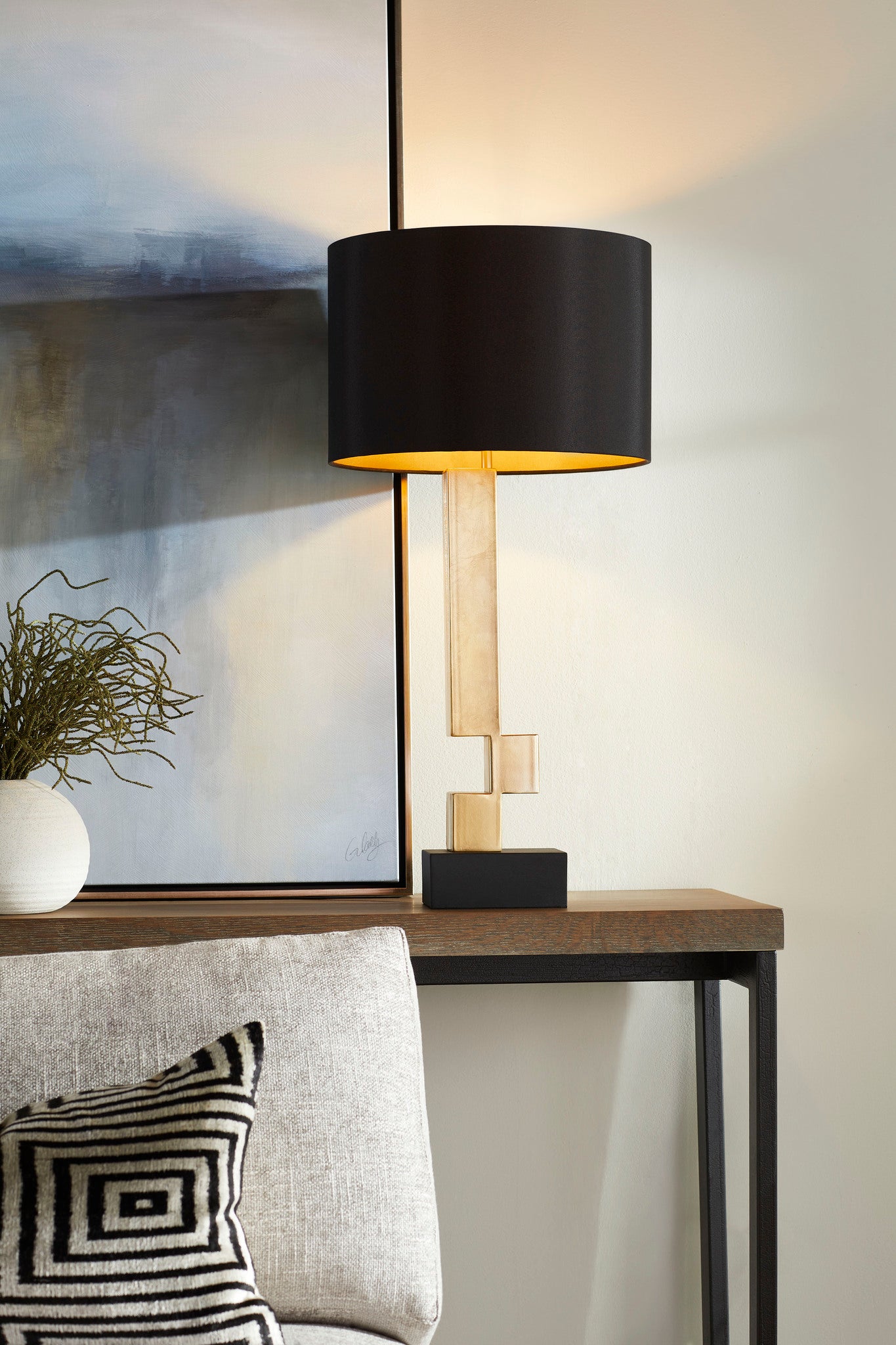 Luxurious, portable, & impactful, a beautiful table lamp keeps your space illuminated in style. The Rendezvous lamp is a simple shaped accent lamp made of iron in a two-toned gold/black finish. Paired with a matching, black finish shade, this lamp is an excellent fit in any modern space for an elegant, functional touch.
