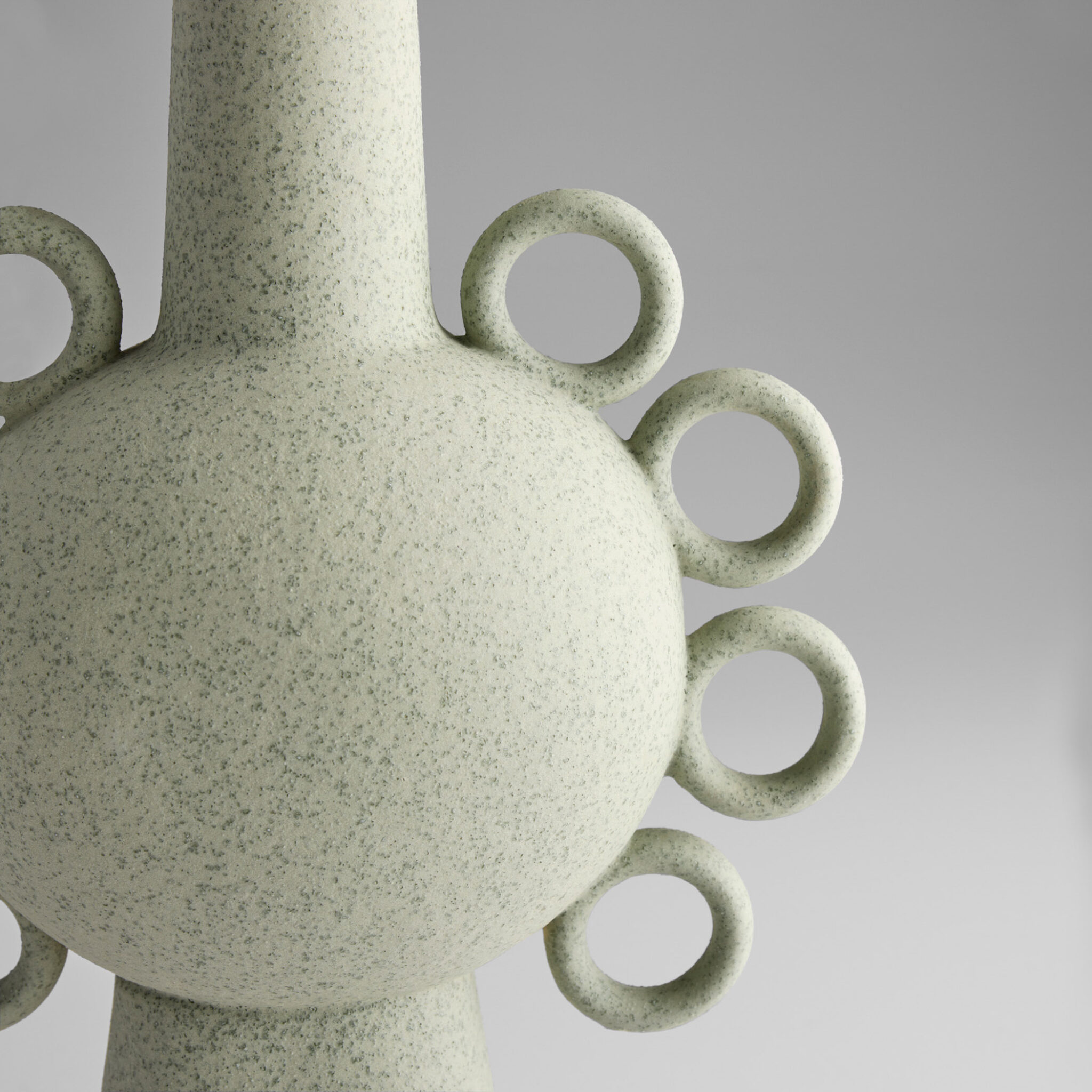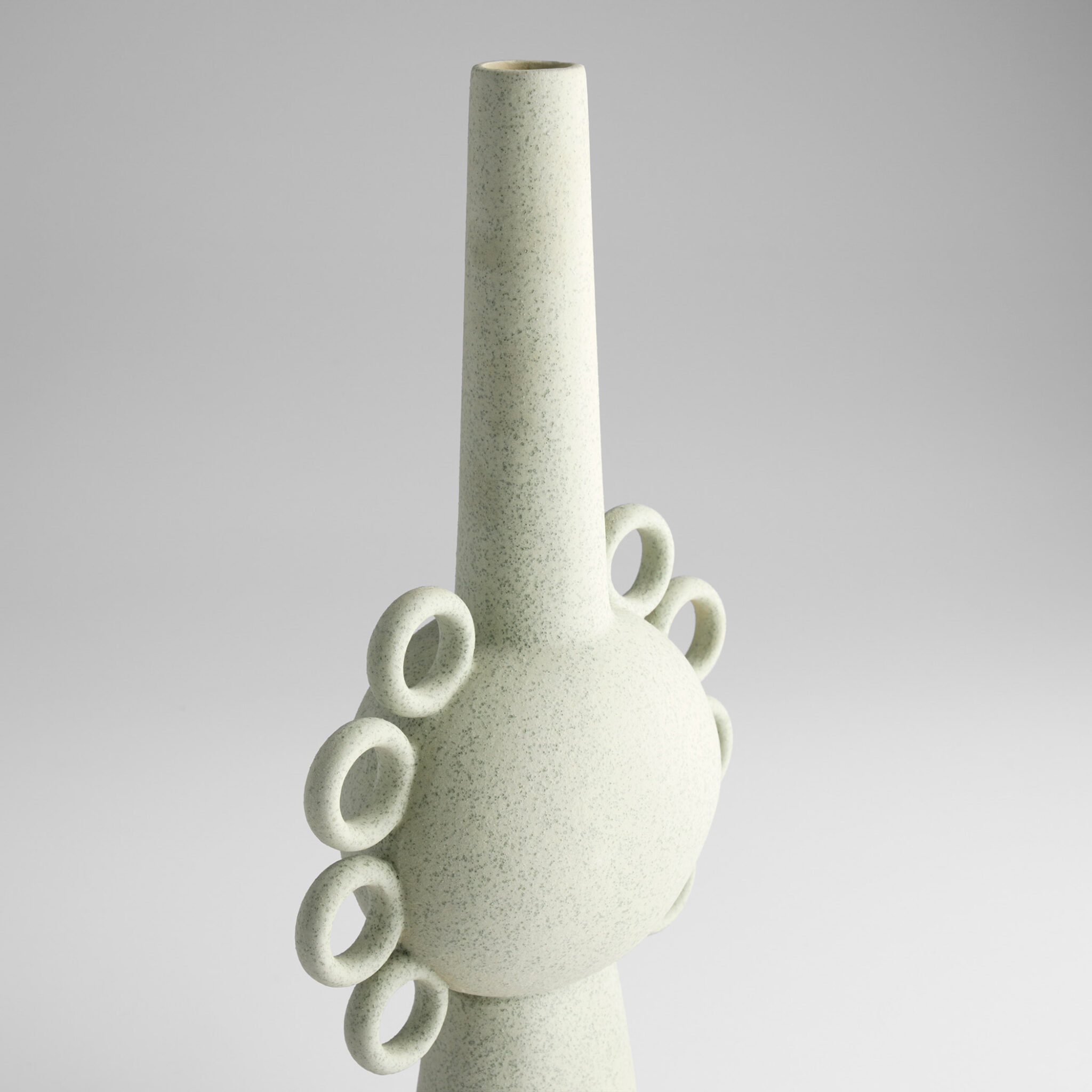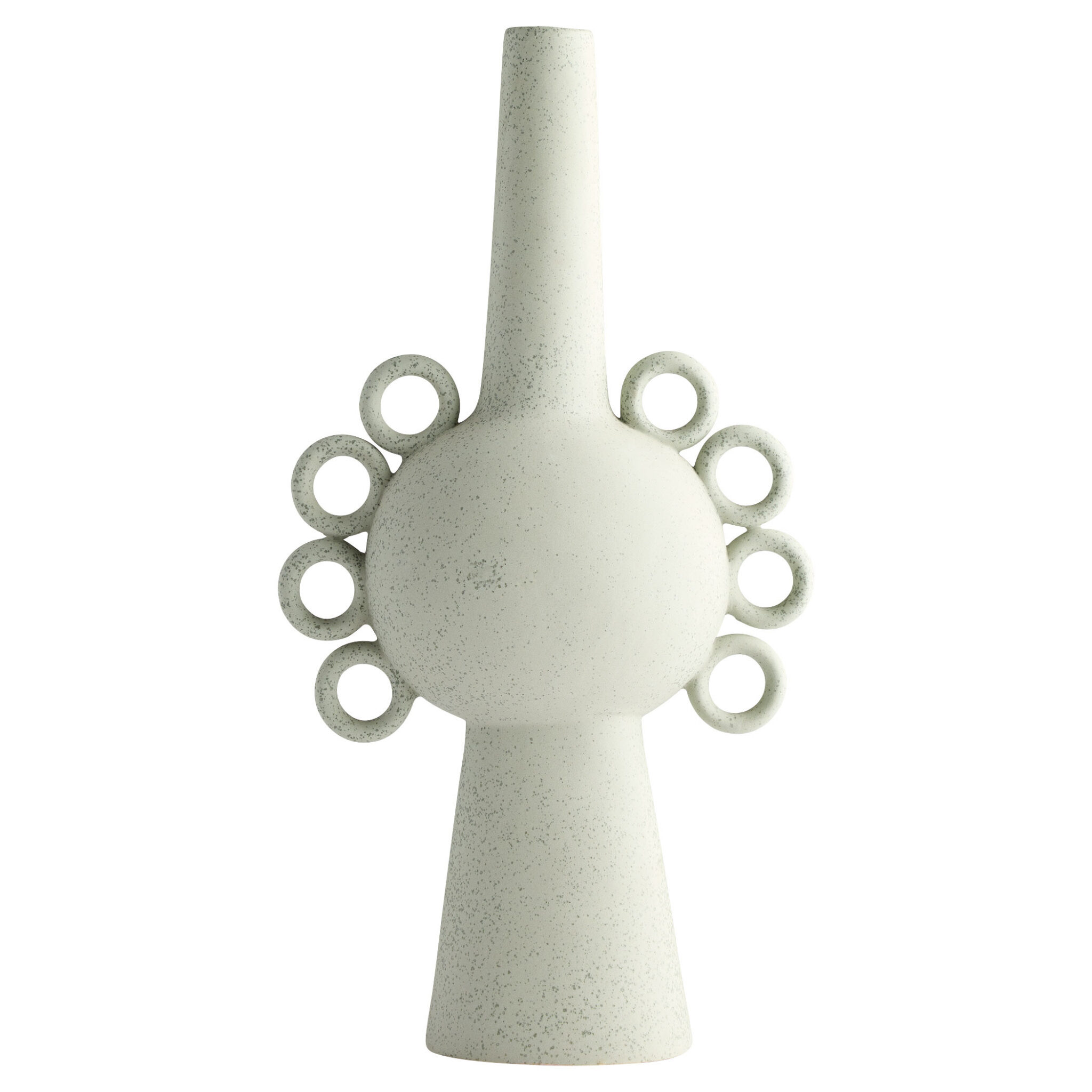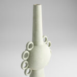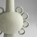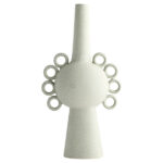This vase possesses an unusual but unique aesthetic design. Its main body consists of a bulb with a wide cone shaped base and a slimmer cone-shaped neck. Eight ringlets are fixed to the bulb section of the vase, which can be used as handles while adding a dynamic element to the vase.
