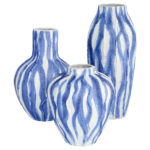 The Ripple Vases are crafted from earthenware, featuring a blend of chalk white and blue reactive glaze that creates a wave-like texture. Each piece adds depth and movement to the design, making these vases ideal for creating a layered, sophisticated display. Available in three sizes, they bring an artistic touch to any space.