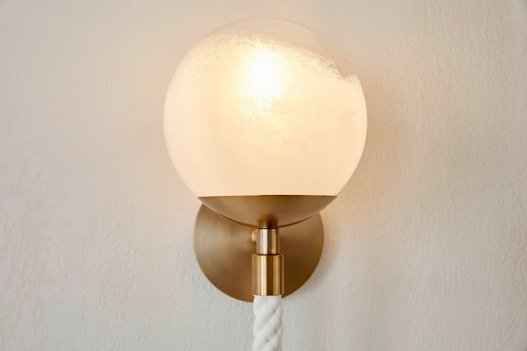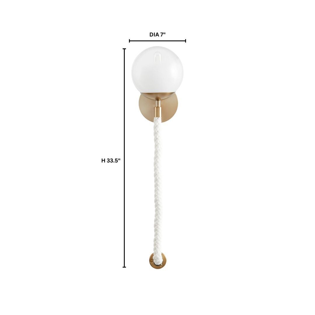 The magic of the Rockport Collection lies in the delicate, wispy, white, and smoky details that gracefully form swirling patterns inside milky glass spheres. These intricate designs capture the essence of the coastal breeze, offering a captivating and whimsical ambiance. Each fixture within this collection is a work of art, with no two alike, showcasing the exquisite craftsmanship and attention to detail. The aged brass canopy and fittings lend an air of vintage charm, while heavy white cotton rope in nautical braids extends gracefully from the glass sphere, attaching to the wall with an aged brass mounting plate.