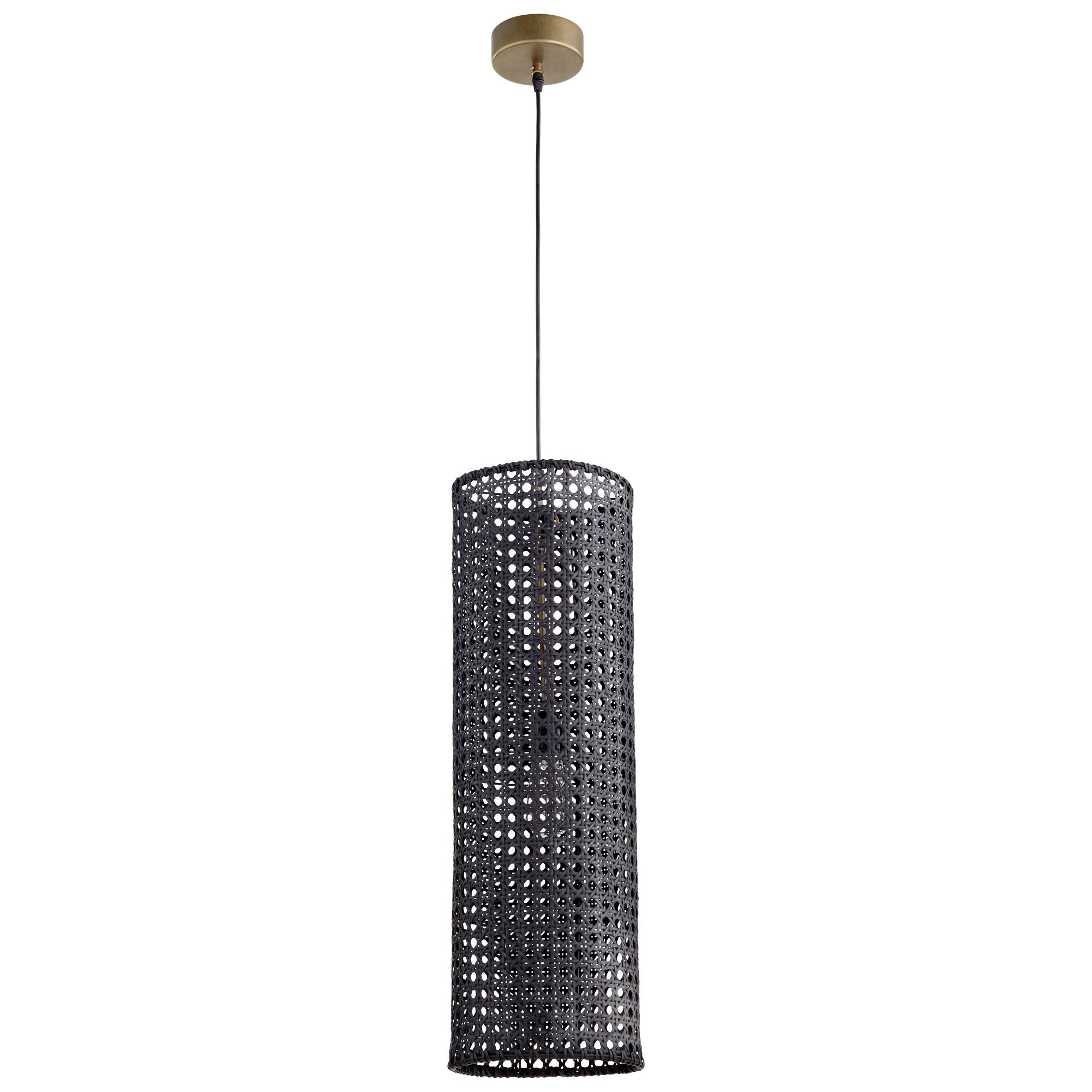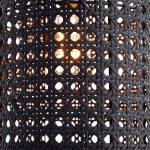 “A great complement to any style, this matte black rattan pendant will cast a luminous glow on your space. Supplied with ten feet of cord, for adjustability to varying ceiling heights. The open aired frame is a great pairing with the artful look. A medium base, 60W bulb is all you need to complete the look.”