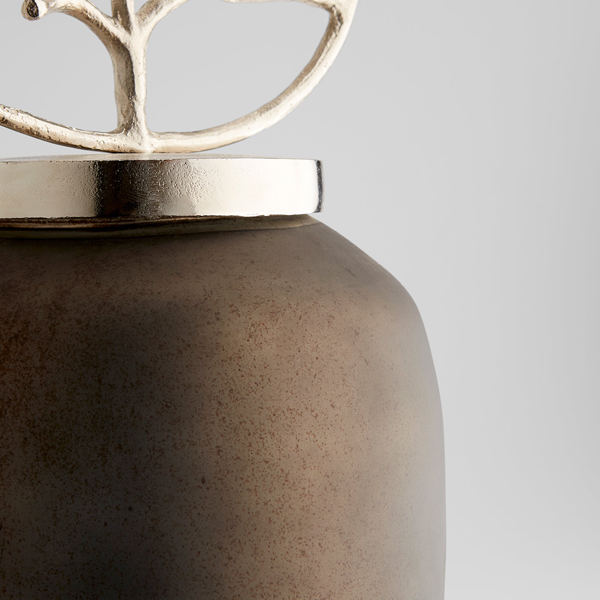“Sporting a smoky quartz and nickel finish, this d?corative sculpture is high art in an unassuming form. Resembling an urn with an accented abstract lid, the appeal in this accessory is in its outdoor influence, thanks to the framed out metallic branch. Whether placed in an entryway or living room, the Round View Leaf sculpture is sure to give your space a modern-organic appeal.”