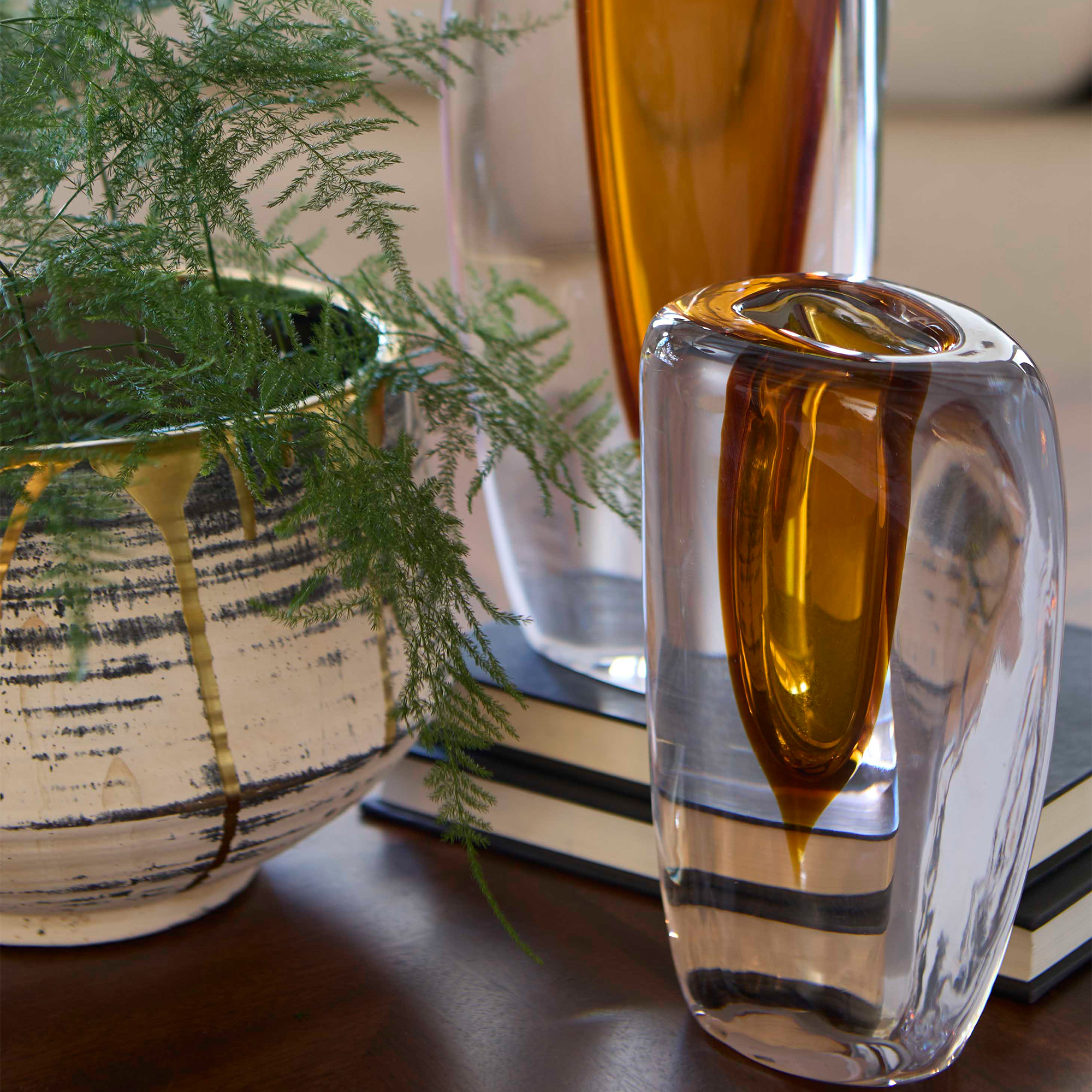 Crafted from hand-blown, thick-cased glass, the Rovno collection is a testament to the artistry and dedication of skilled artisans. Delicately formed within the glass, an intricate swirl of the amber-colored inner layer extends into the clear base. Notably, the Rovno Collection boasts a substantial weight, a testament to its quality and craftsmanship. This heaviness adds to the collection’s allure, emphasizing its luxurious feel and making it a statement piece in any setting. Available in three sizes.