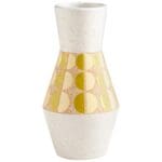 This southwestern style vase features a compact trumpet silhouette with decorative circular patterns surrounding the middle rim. The design is juxtaposed with a creamy white finish that allows the patterns to pop. A broad base coated in matte white provides some sturdy reinforcement for balance on any coffee table, kitchen counter, or entryway console surface. Add this whimsical accent to your shabby-chic, bohemian, or natural themed aesthetics. Great for commercial as well as residential use.